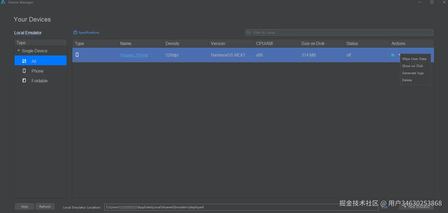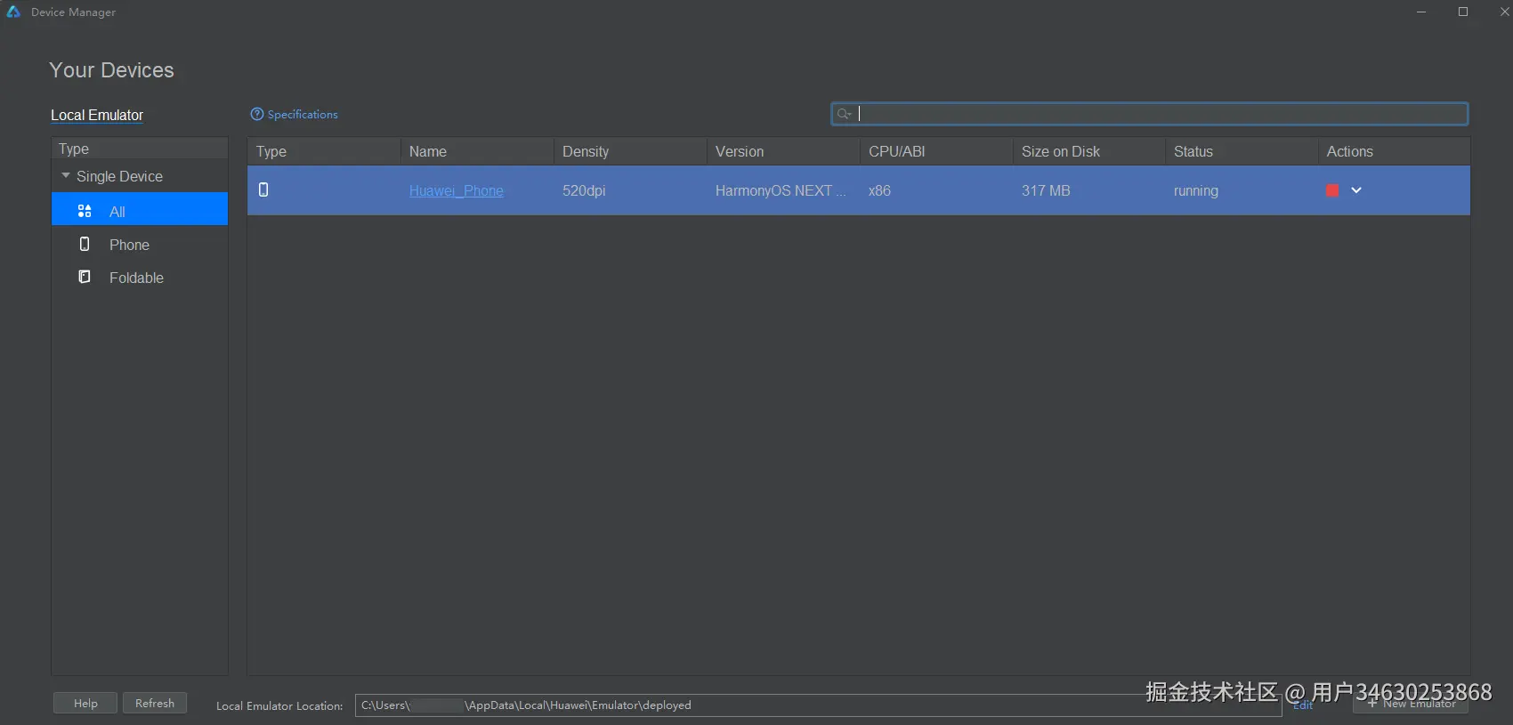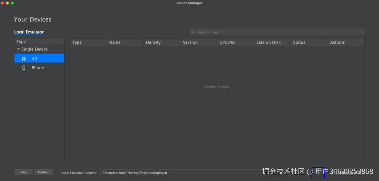 - 点击菜单栏的Tools > Device Manager,点击右下角的Edit设置模拟器实例的存储路径Local Emulator Location,Mac默认存储在~/.Huawei/Emulator/deployed下,Windows默认存储在C:\Users\xxx\AppData\Local\Huawei\Emulator\deployed下。