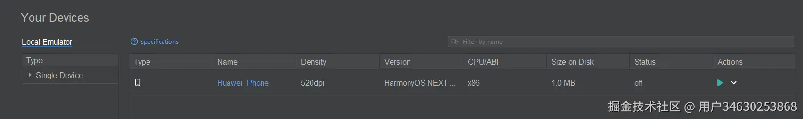 - 在Local Emulator页签中,单击右下角的New Emulator按钮,创建一个模拟器。