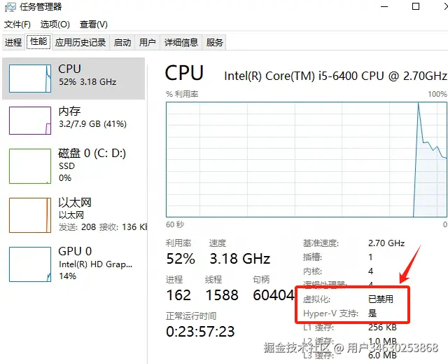 - 如果按照上述步骤无法解决,打开任务管理器->性能,若显示虚拟化已禁用或未开启,则是BIOS中虚拟化没有开启,请根据计算机的主板型号,进入BIOS设置界面,并开启虚拟化功能。