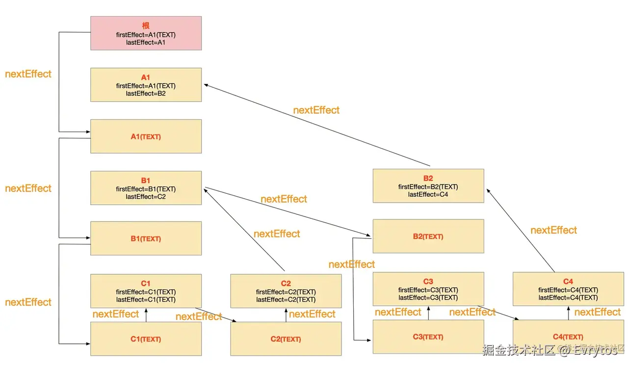 diff 结果: 通过 effect Tag + effect List 连接起来,更新的时候直接遍历