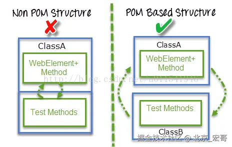 从上图看出,采取了POM设计思路和不采取的区别,左侧把测试代码和页面元素都写在一个类文件,如果需要更改页面,那么就要修改页面元素定位,从而要修改这个类中测试代码,这个看起来和混乱。右侧,采取POM后,主要的区别就是,把页面元素和业务