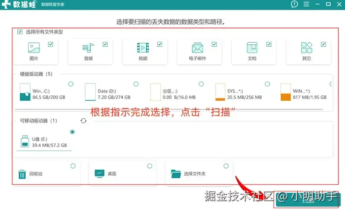 步骤1:打开软件,在首页上选择恢复的文件类型和选择丢失文件的U盘作为扫描对象(需要确保U盘已经连接上电脑),点击“扫描”;