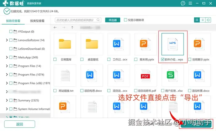 步骤2:在软件扫描结束后,在指定位置选择需要恢复的文件,勾选好后点击“导出”;