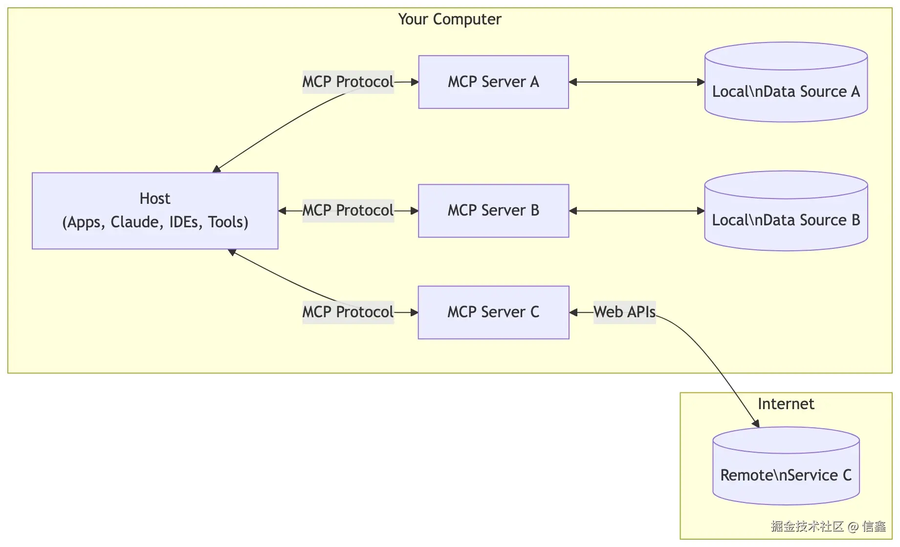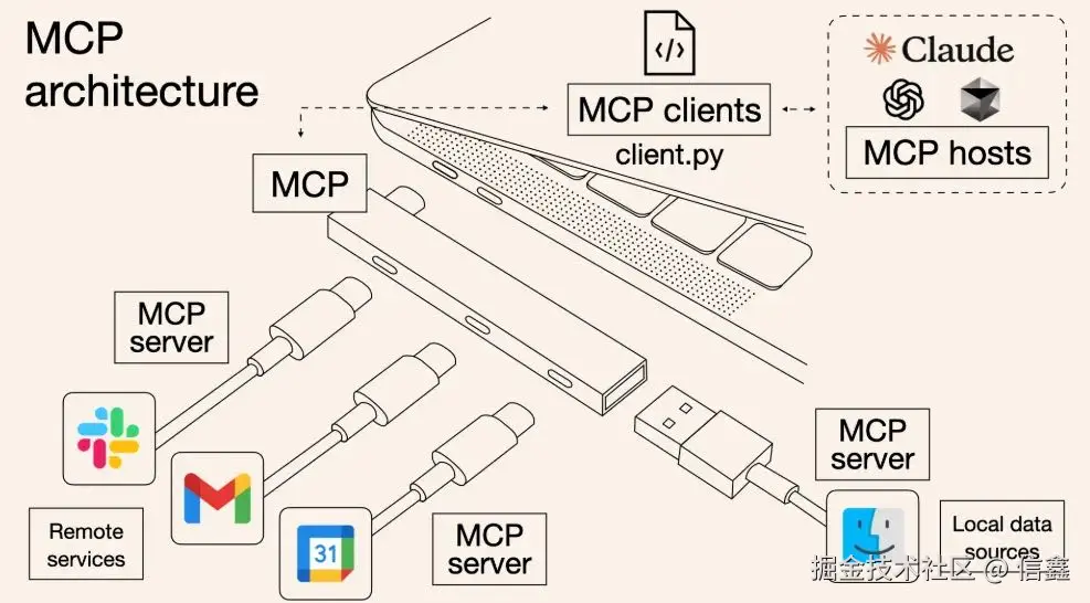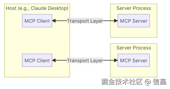 - MCP Client:通过 MCP 协议与 Servers 通信,并保持 1:1 连接