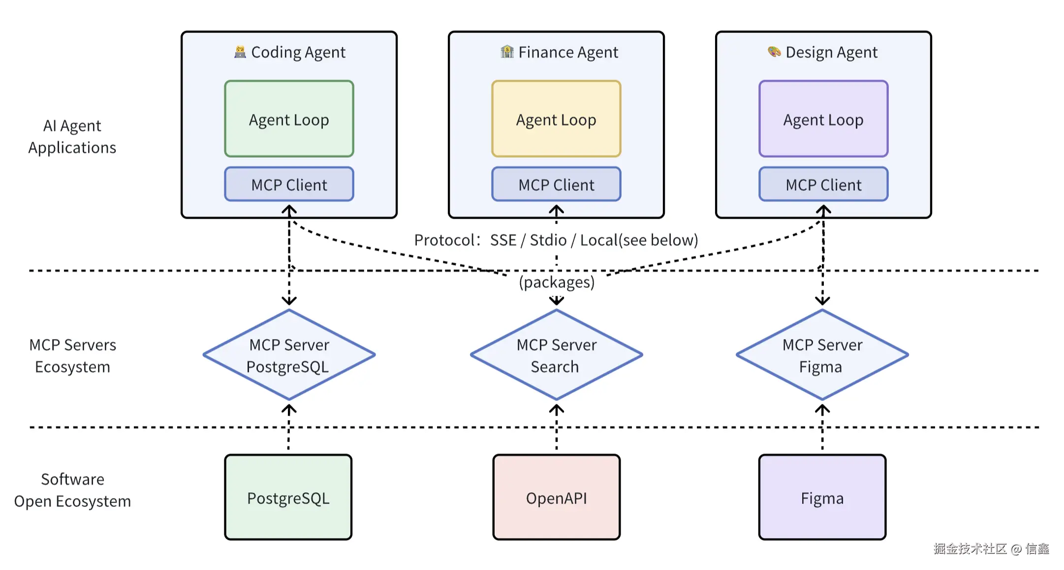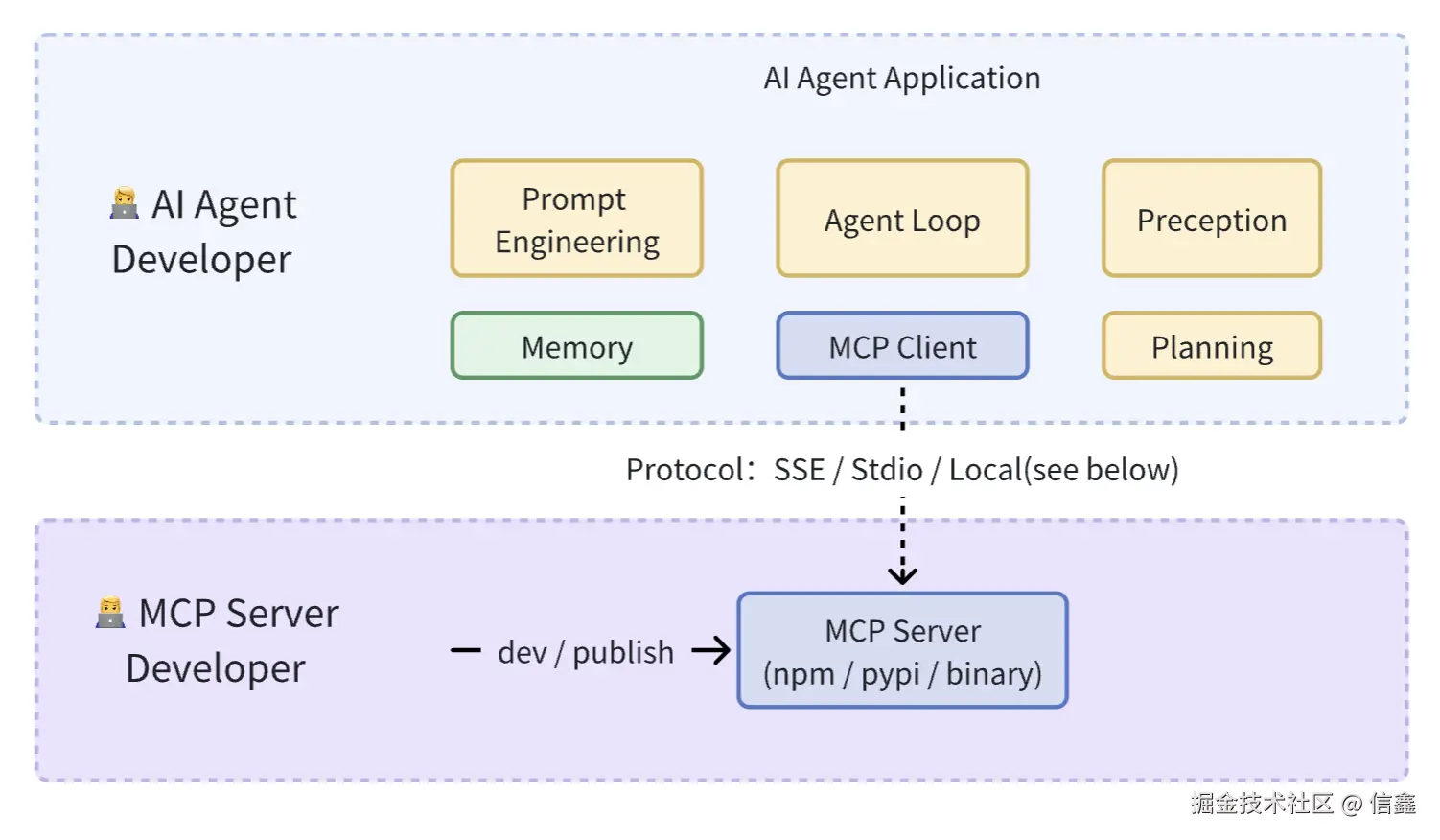 MCP 分层:让工具开发者和 Agent 开发者各司其职,工具质量和功能的迭代不需要 Agent 开发者感知。这种分层让 AI Agent 开发者能像搭积木一样组合工具,快速构建复杂 AI 应用。