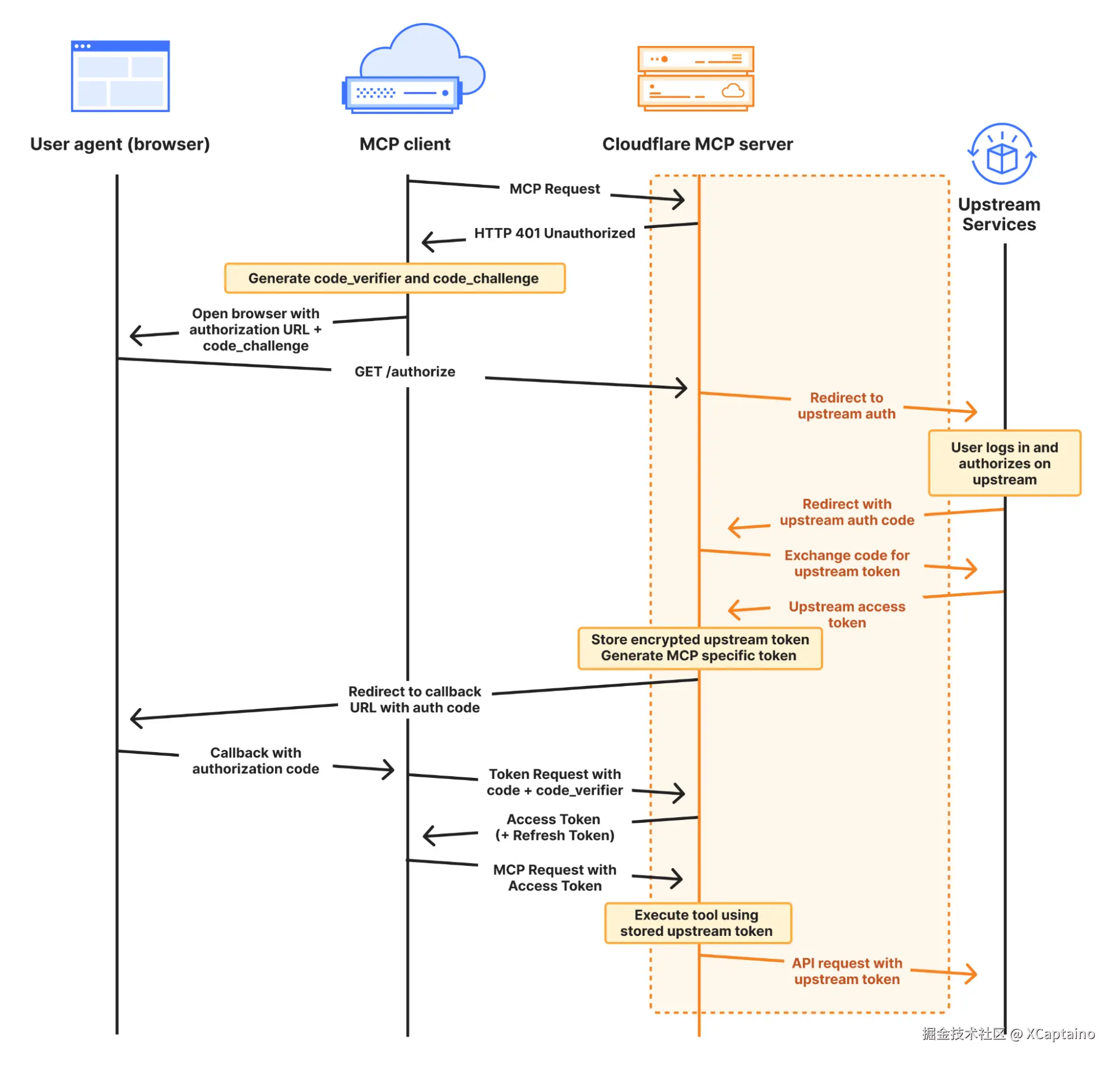 当你将 部署一个 MCP 服务器 到 Cloudflare 时,你的 Worker 充当 OAuth 提供者,使用 workers-oauth-provider,这是一个新的 TypeScript 库,它包装了 Worker 的代码,并为 API 端点(包括但不限于 MCP 服务器 API 端点)添加了授权。