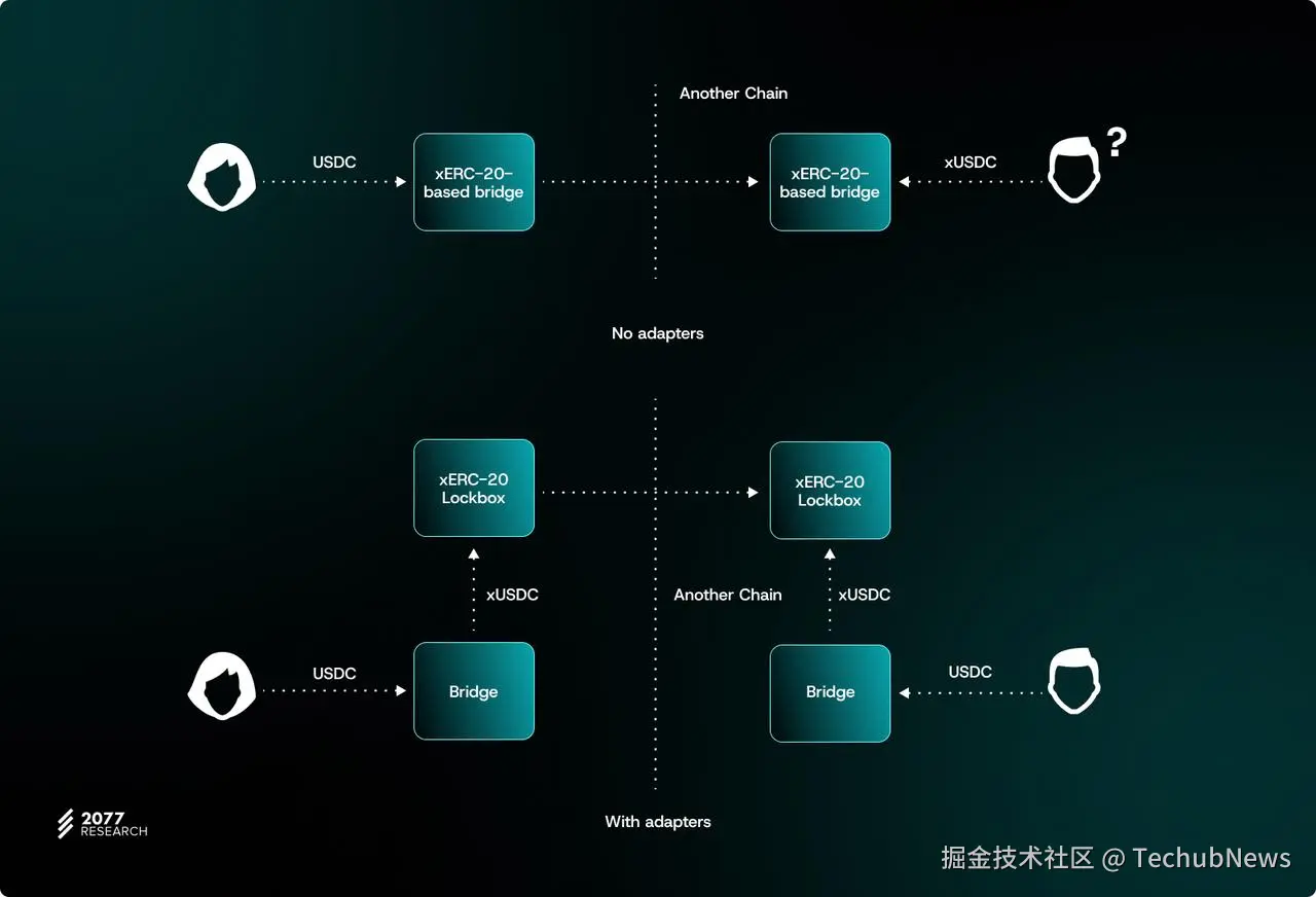 如果跨链协议无法识别 xERC‑20 代币固有的操作(铸造/销毁、事件日志记录等),则应用层可以构建适配器合约。这些合约可充当自动包装器和解包器,有效地将 ERC‑20 批准 + 调用(call)行为转换为 xERC‑20 标准所需的更细致的铸造/销毁方案。
