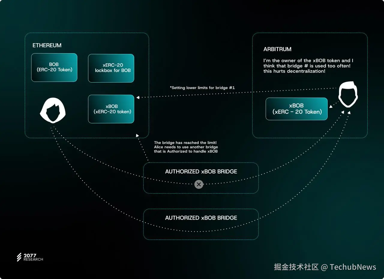如果一个具有高限制的跨链桥遭到攻击,其影响可能十分显著,甚至影响到使用其他铸造相同代币的跨链桥的用户。所以,协议可以通过将铸造权分配给多个跨链桥来降低风险(因此,与其他跨链桥相比,一个跨链桥提供商所能铸造的代币数量就不会过大),但通过这种方式来规避风险可能会降低效率,因为每个跨链桥都需要 DAO 团队进行独立评估,并且与更多跨链桥进行协调,这样又会增加上文提到的管理成本。