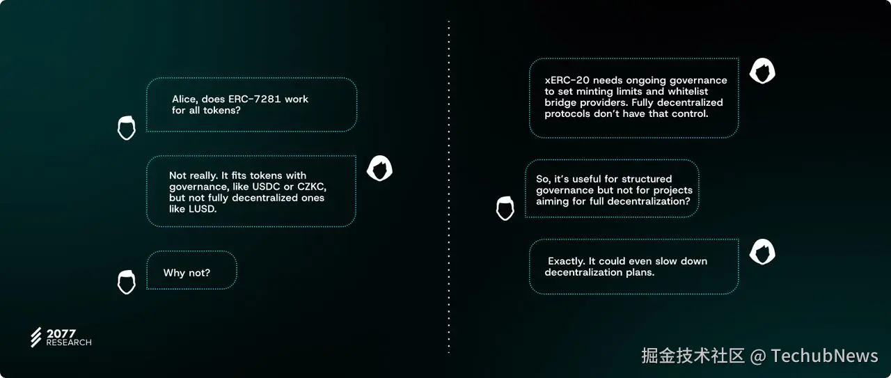 假设一个协议之前使用内部基础设施管理跨链代币(例如,为每条链部署单独的代币合约,并控制铸造和销毁)。在这种情况下,ERC-7281似乎并不是一个根本性的改变。然而,那些习惯于将核心跨链基础设施的管理外包给跨链桥开发团队的项目会发现,额外的工作量令人担忧。
