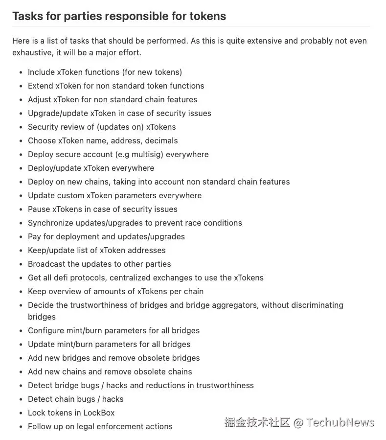 Gerard Persoon 在《管理大量链上的跨链代币》一文中列出了从 ERC-20 迁移到 xERC-20 后,协议必须执行的一次性和重复性任务的不完整清单:
