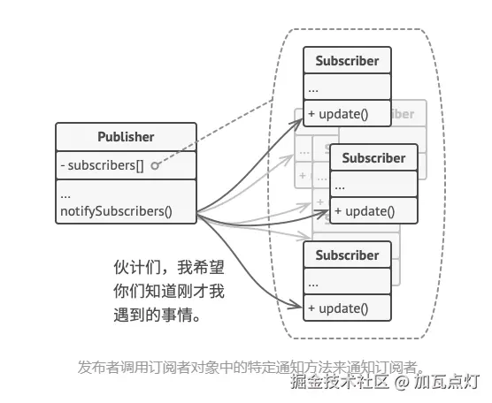 因此, 所有订阅者都必须实现同样的接口, 发布者仅通过该接口与订阅者交互。 接口中必须声明通知方法及其参数, 这样发布者在发出通知时还能传递一些上下文数据。