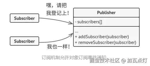 观察者模式建议你为发布者类添加订阅机制, 让每个对象都能订阅或取消订阅发布者事件流。 不要害怕! 这并不像听上去那么复杂。 实际上, 该机制包括