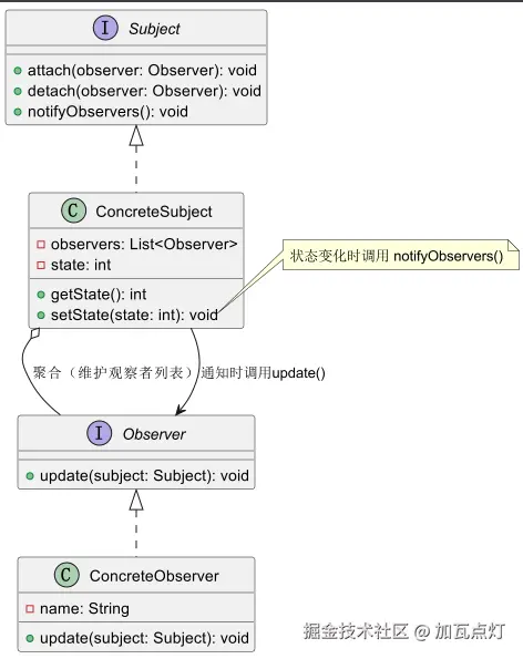 - ConcreteSubject:维护观察者列表,存储状态,状态变化时触发通知。