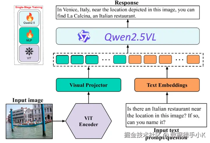 具有单阶段训练策略的 GAEA 架构,包括可训练的 MLP 层和LLM权重。