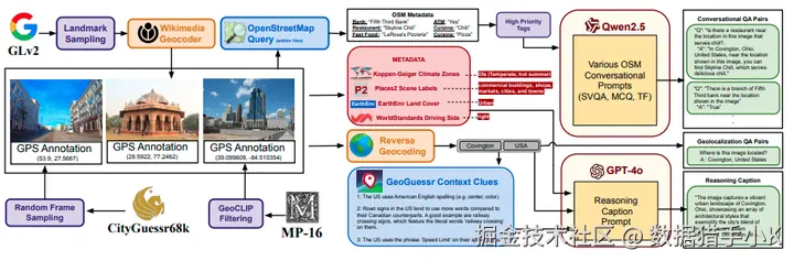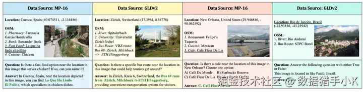 问答对生成:通过开源 LLMs 和 GPT-4o 生成了 160 万问答对,涵盖地理定位、推理和对话等多个方面。