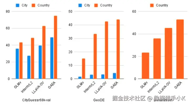 城市和国家标签的分类准确性,其中 GAEA 将自己确立为强大的基线,在性能上超过了最近的几个 LMM。