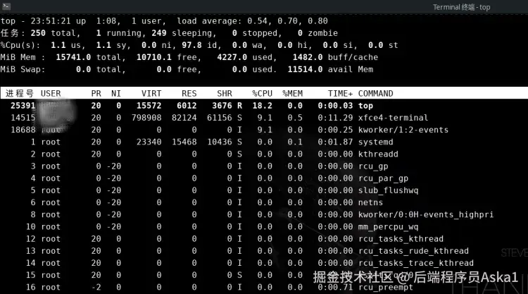 运行代码后,CPU使用率 us和sy都有升高,同时进程列表中的java进程CPU使用一列也大幅度升高。