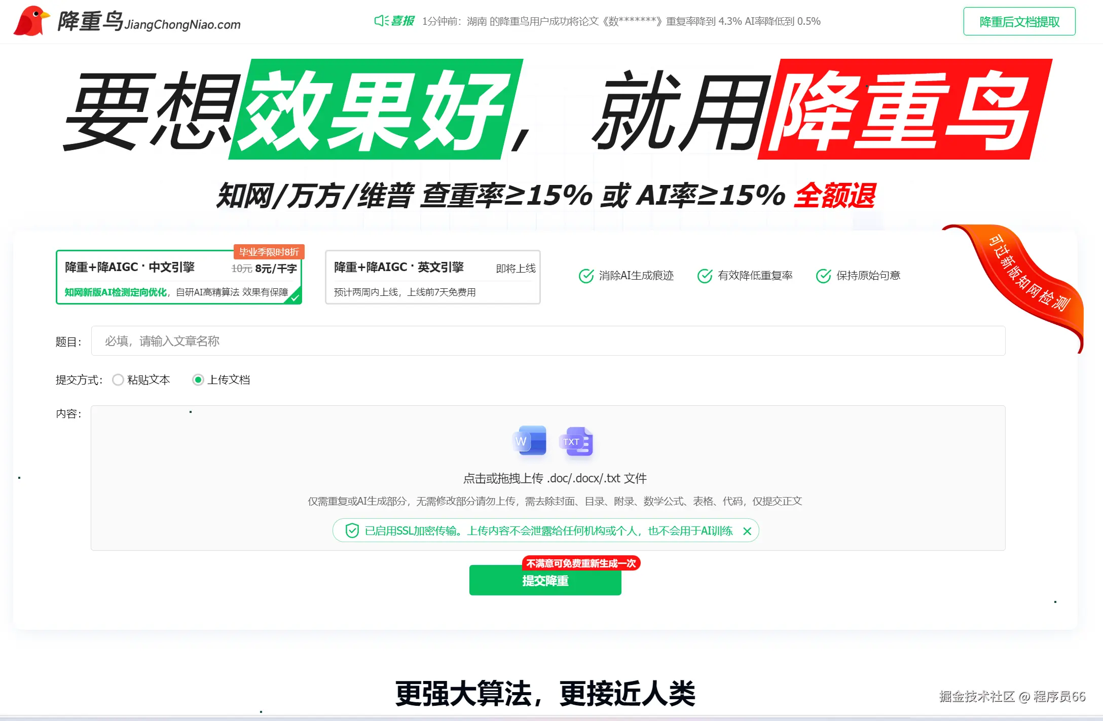 先来说说降重鸟,这可是我重点要讲的。降重鸟支持两种方式检测,一种呢,就是直接粘贴文本,把你写好的内容一股脑地粘贴进去,它就能开始工作啦;另一种就是文件上传检测,要是你的论文已经整理成文档了,那就直接上传文件就行,方便得很。而且啊,要是它检测完了,你觉得效果不太理想,别担心,它还能再给你重新生成一次,就像是给了你第二次机会一样。再说说它对查重系统的兼容性,新版本的知网和新版维普,它都能很好地应对,对于降低AI率这件事,那可是得心应手。还有个挺贴心的功能,它支持订单号提取文档,文档保存14天,在这14天里呢,不用担心文章会被收录,安全性妥妥的。