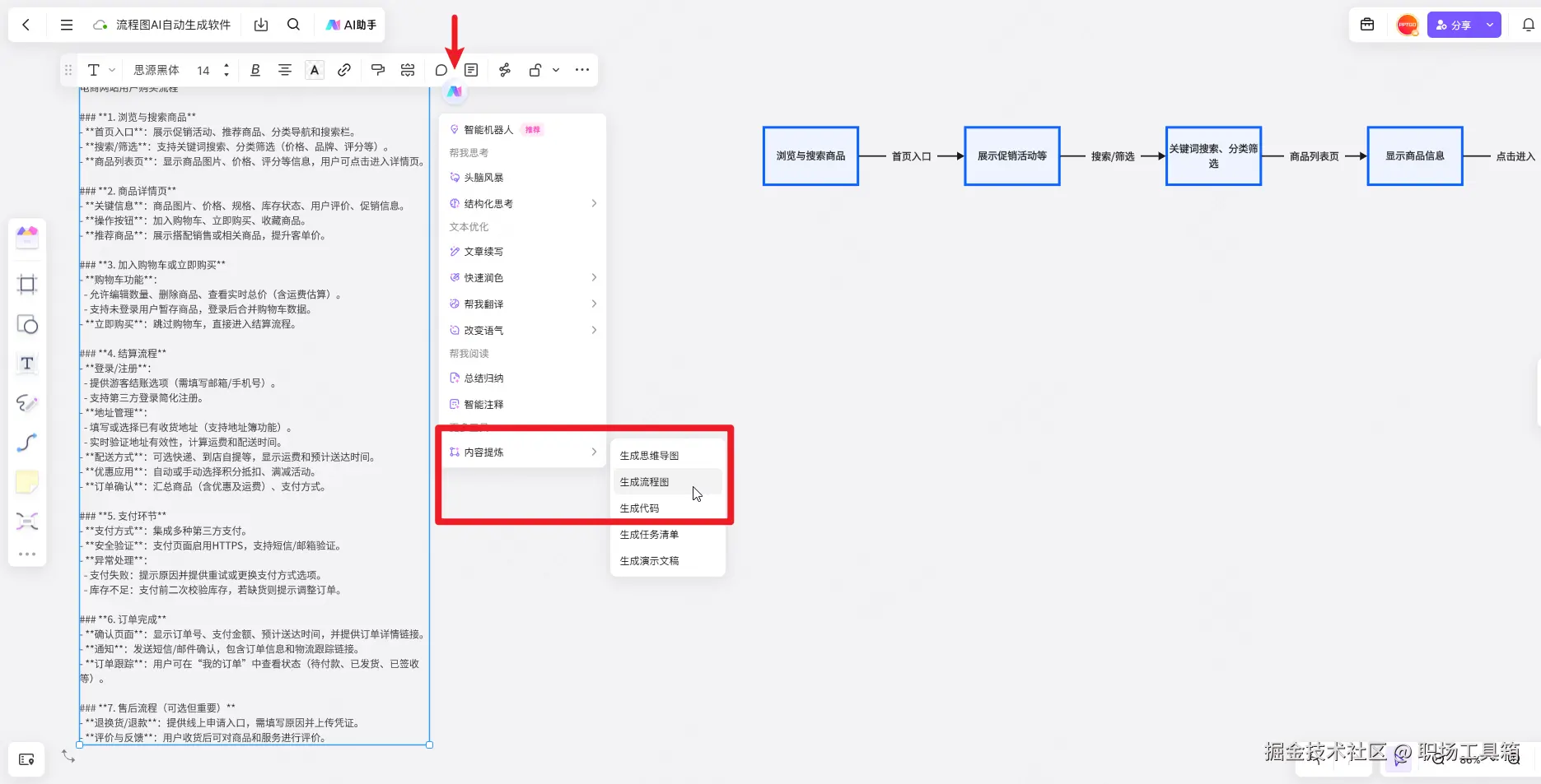 选中这些步骤文本,点击右上角的AI图标,选择"内容提炼 > 生成流程图",AI会自动将文本转换为可视化的流程图,如下图所示。