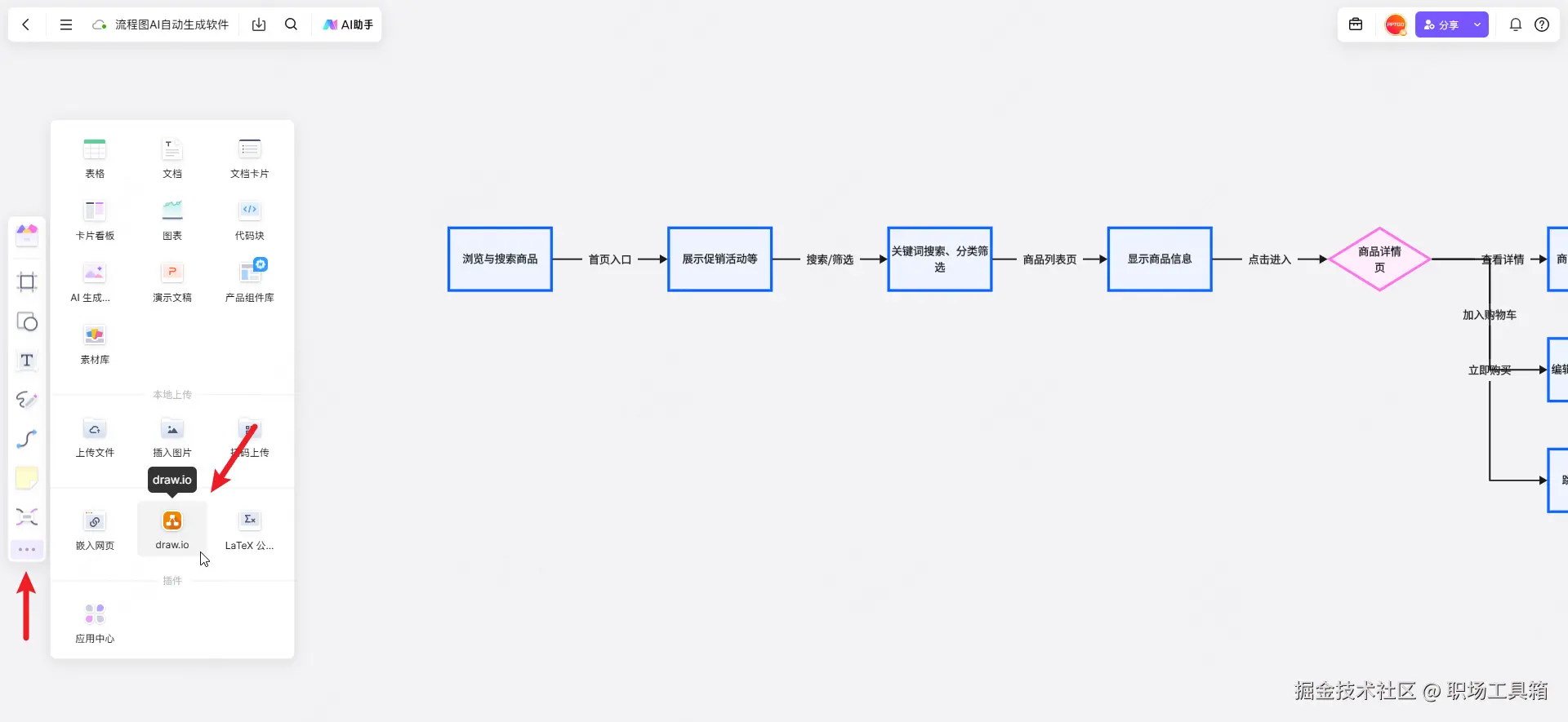 值得一提的是,前面介绍的AI自动生成流程图工具boardmix已经内嵌drawio,免去应用切换,可以更无缝地将AI生成的PlantUML流程步骤转换为可视化流程图,提高工作效率。