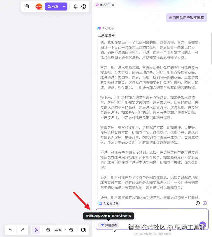在boardmix中创建新白板,点击boardmix画布左上角的"AI助手",然后点击输入框左下角的"深度思考"按钮启用DeepSeek,输入流程图主题或描述,让DeepSeek生成详细的流程步骤