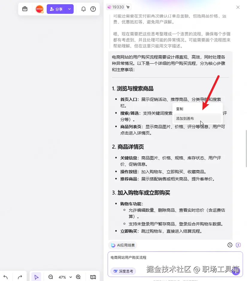 输入你需要的流程描述,如"电商网站用户购买流程",boardmix AI智能体会根据你的描述自动生成一个结构化的流程图,并自动将流程图置入左侧的无限画布中。