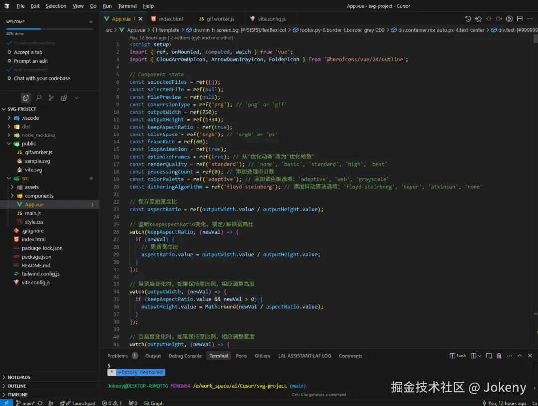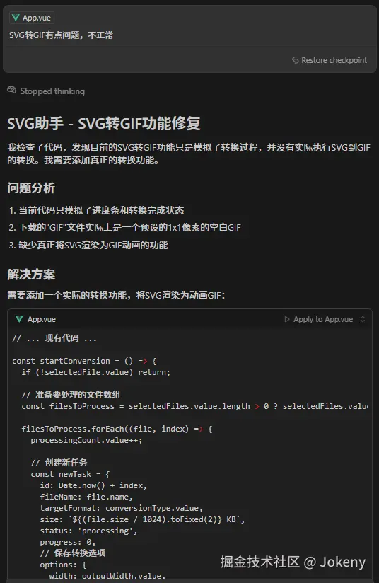 提交提示词后,我就可以暂时放松一下,喝杯咖啡啦。Cursor会自动设计项目结构、写核心转换功能、实现文件上传组件、布局UI界面,甚至处理各种边界情况。大概5分钟,一个基本可用的工具就出来了,效率超高!