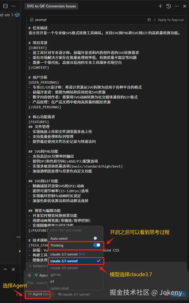 开发的第一步,就是在Cursor里输入一段提示词。提示词非常重要,它详细描述了要开发的SVG格式转换工具网站的功能和要求。比如用户需求分析、功能模块规划、界面设计要求等,把功能要点和技术细节都说明白了。这样AI就能根据这些信息生成准确的代码。