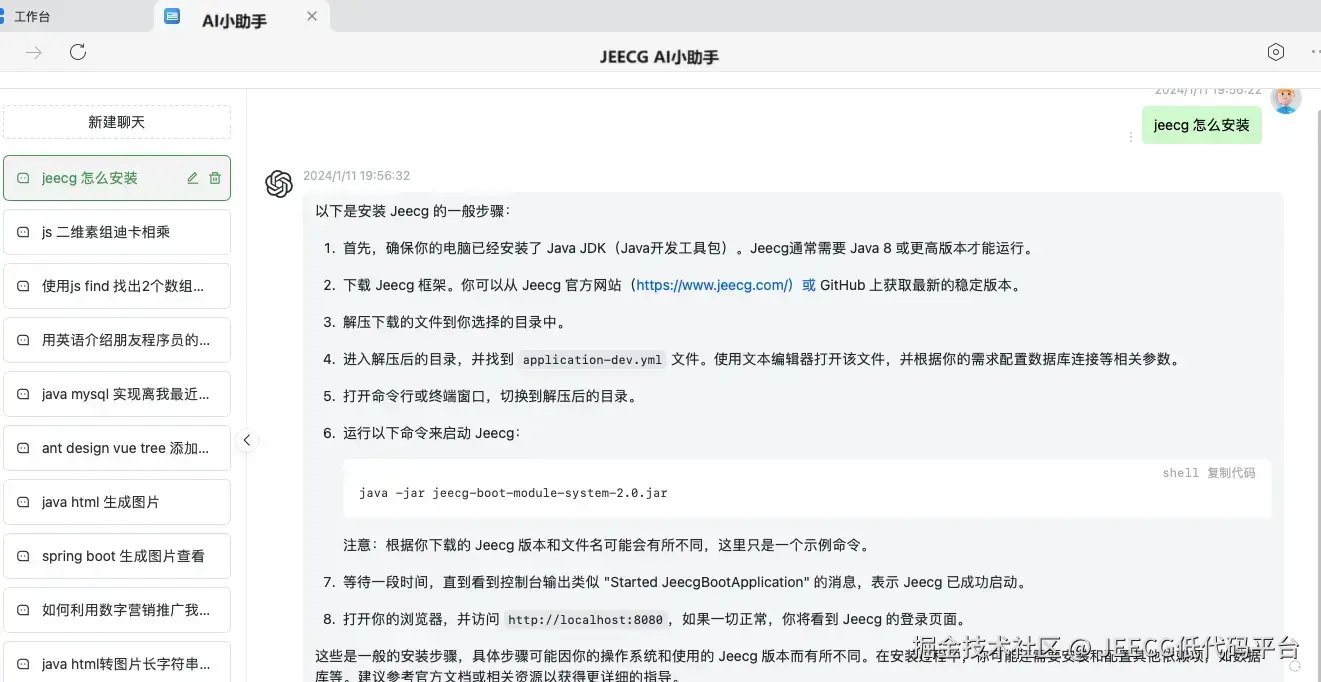 - AI能力:目前JeecgBoot支持AI大模型chatgpt和deepseek,现在最新版默认使用deepseek,速度更快质量更高。目前提供了AI对话助手、AI建表、AI报表等功能。