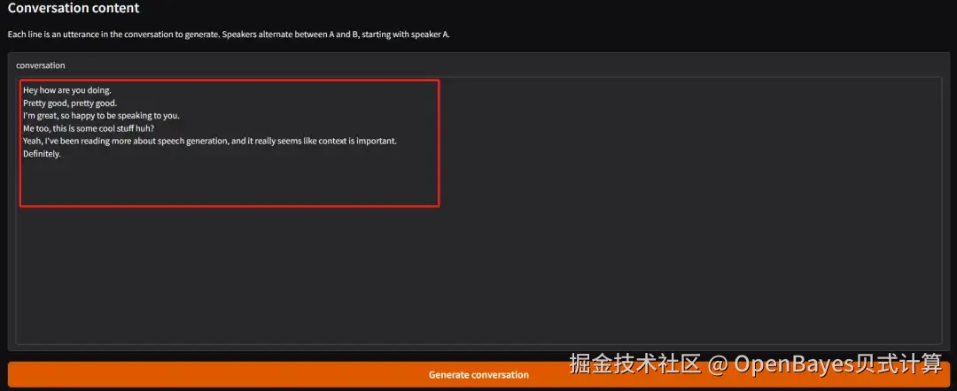 *默认情况下,将由 Speaker A 开启首轮发言,随后 Speaker A 与 Speaker B 交替进行对话交流(目前仅支持英文内容生成)。