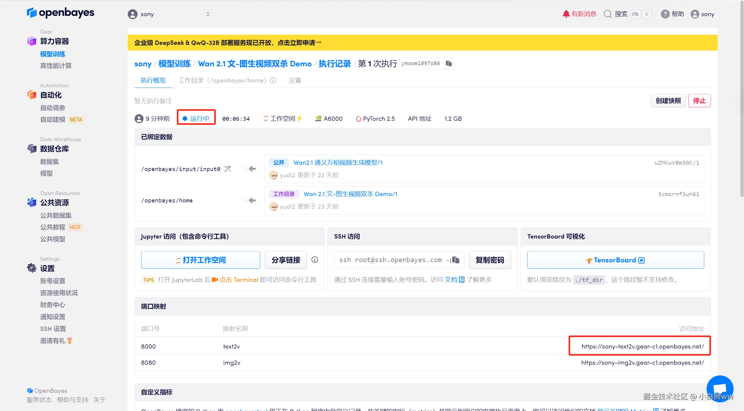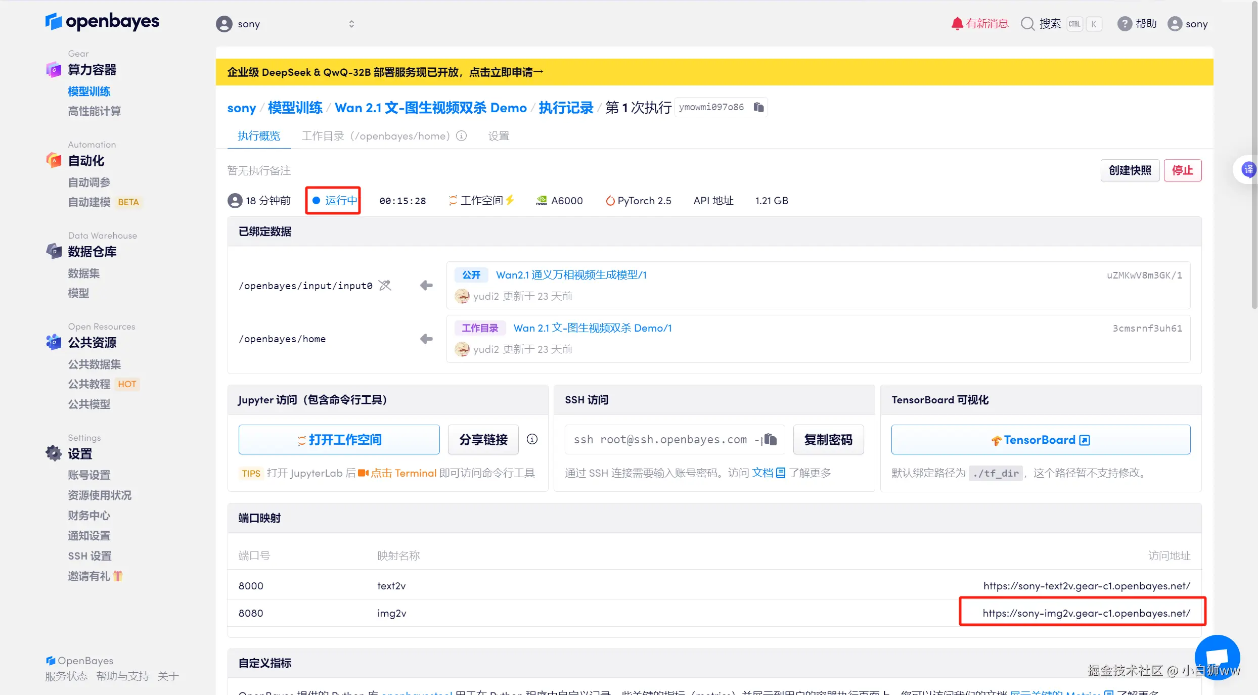 待系统分配好资源,当状态变为「运行中」后,访问模型给出的连接「sony-img2v.gear-c1.openbayes.net/」,进入图生视频 Demo 界面。