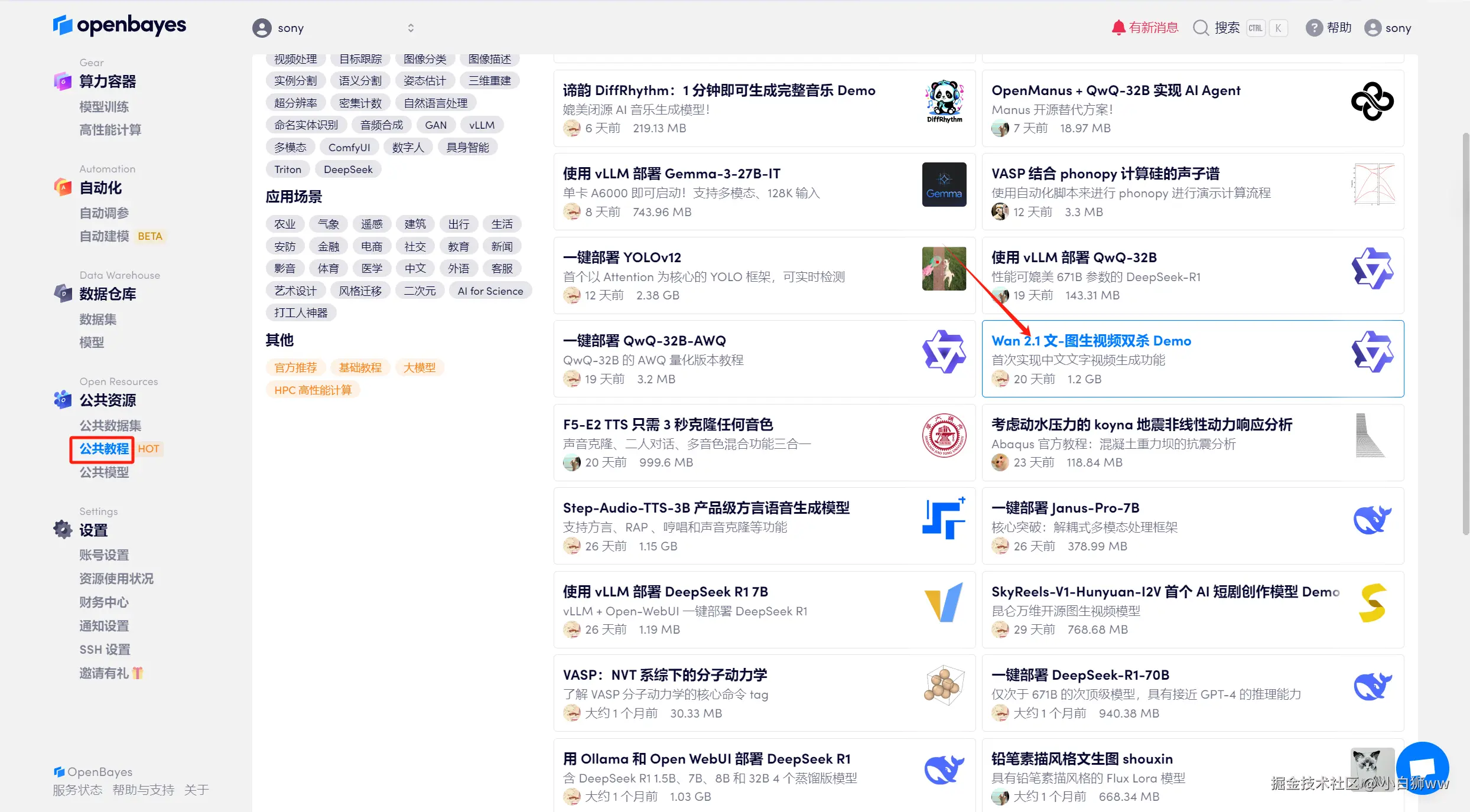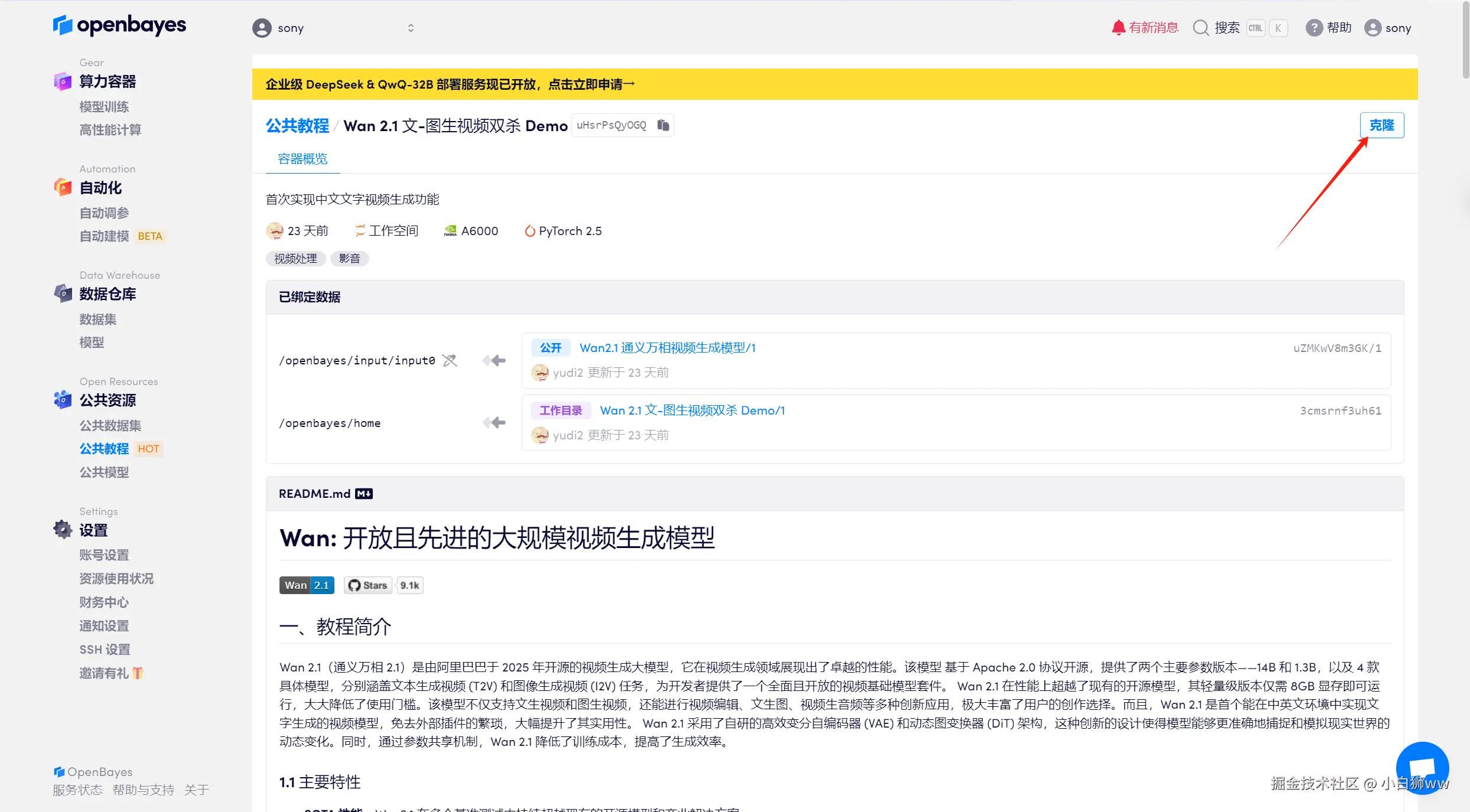 登录 OpenBayes.com,在「公共教程」页面,选择键部署 「Wan 2.1 文-图生视频双杀 Demo」教程。