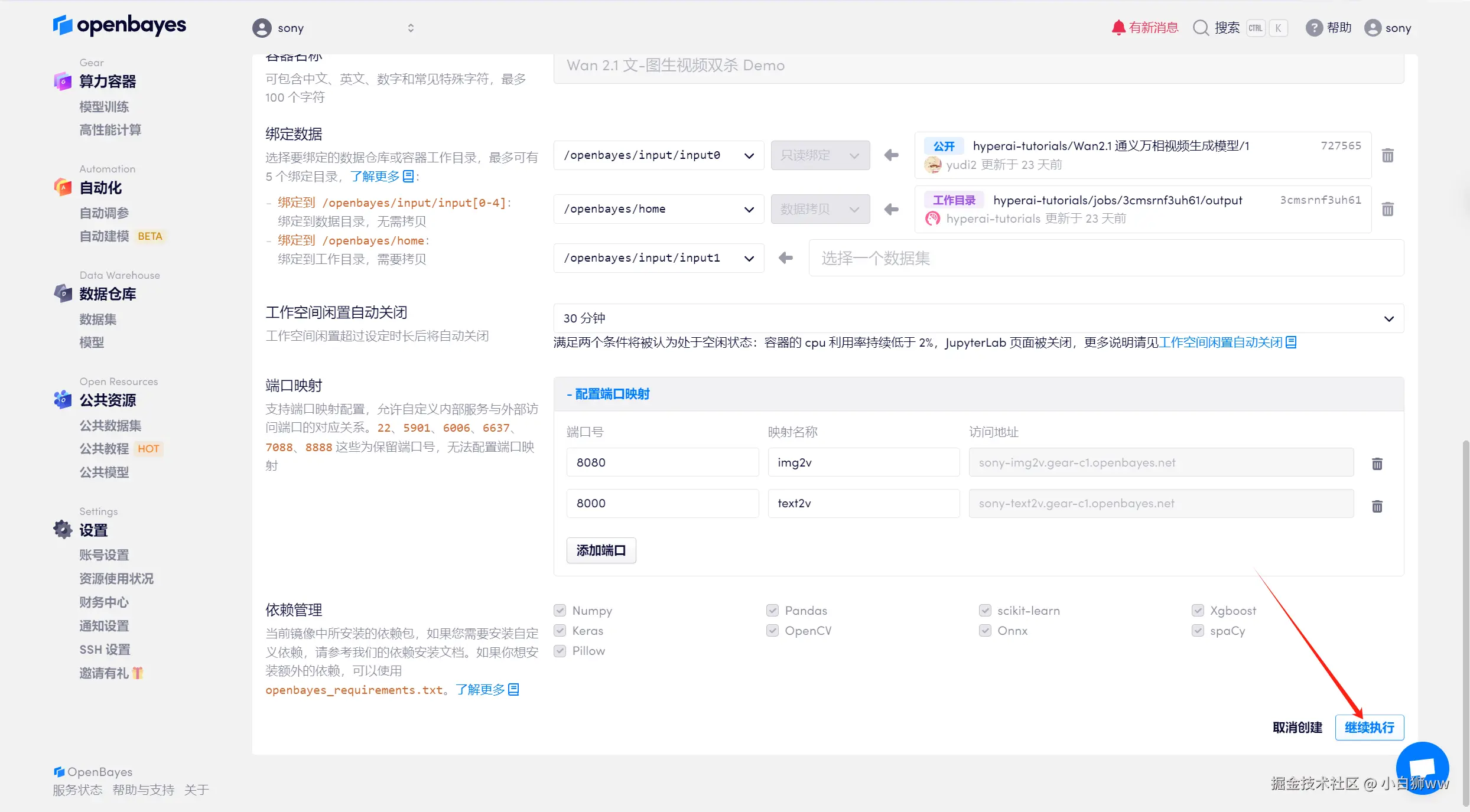 选择「NVIDIA RTX A6000」以及「vLLM」镜像,OpenBayes 平台提供了 4 种计费方式,大家可以按照需求选择「按量付费」或「包日/周/月」,点击「继续执行」。可以使用文章开头的邀请链接,获得 RTX 4090 使用时长!