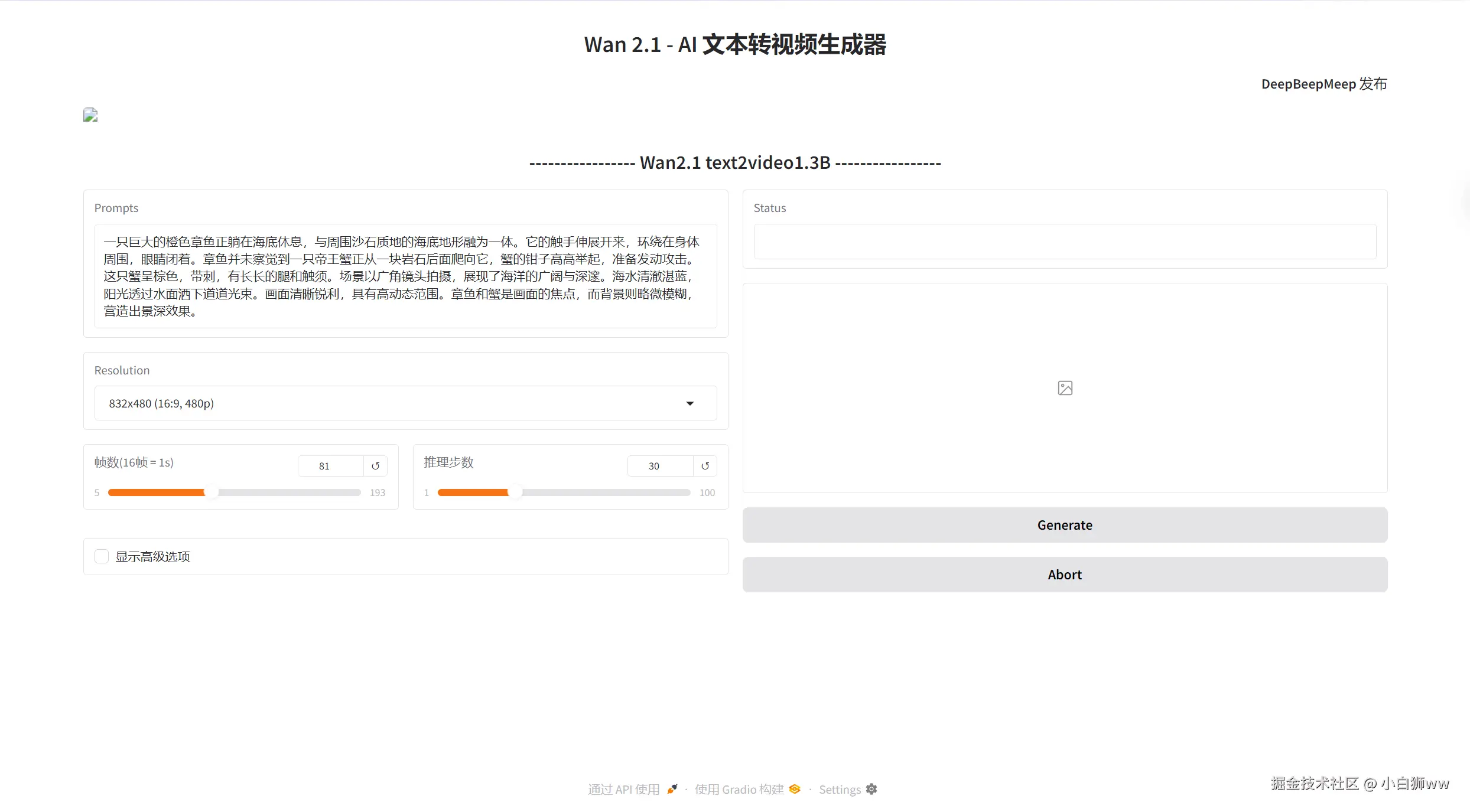 我们在「Prompts」中输入一段文字描述,在「Resolution」处选择输出尺寸,根据自己需求设置好帧数和推理步数,最后点击「Generate」生成。