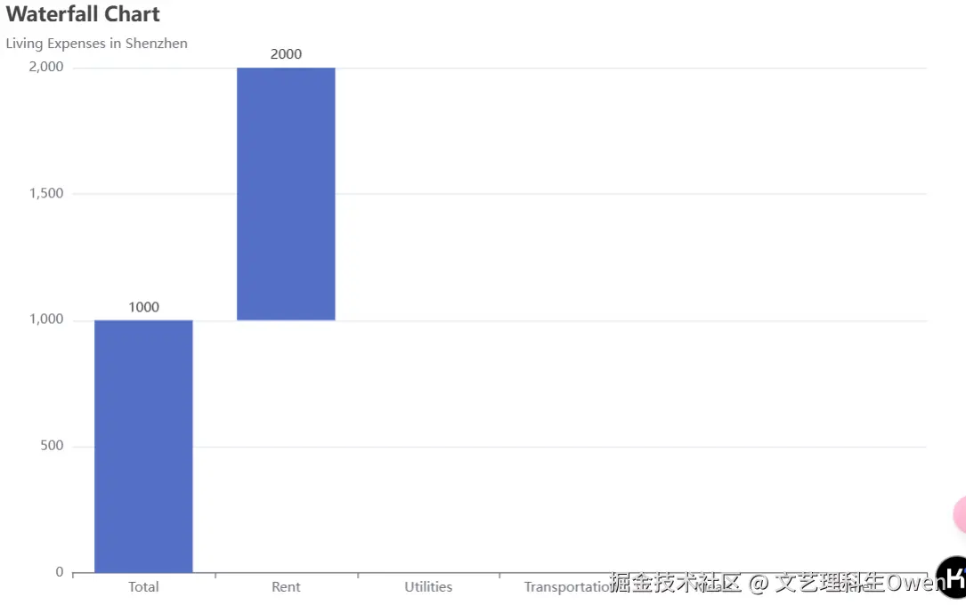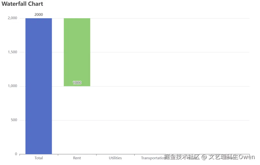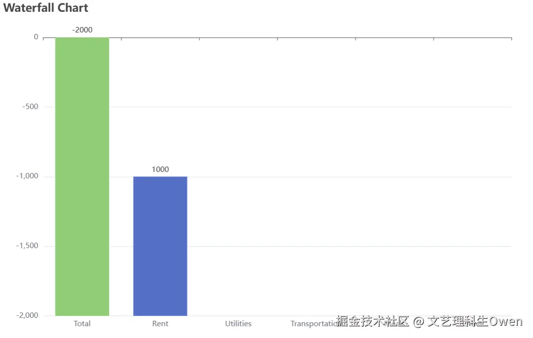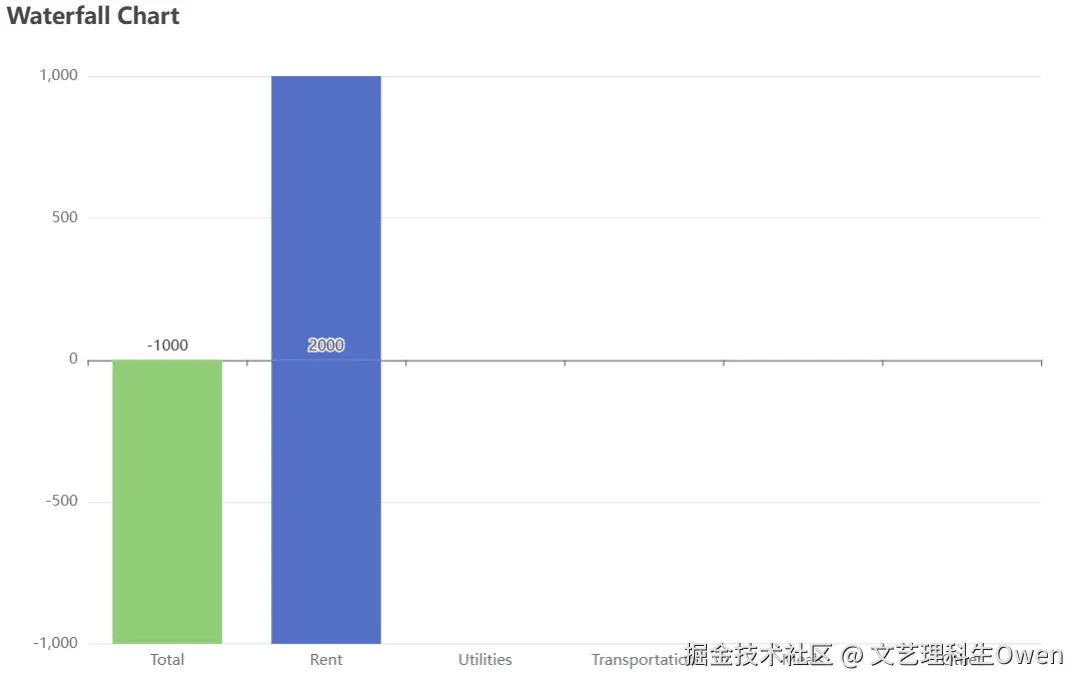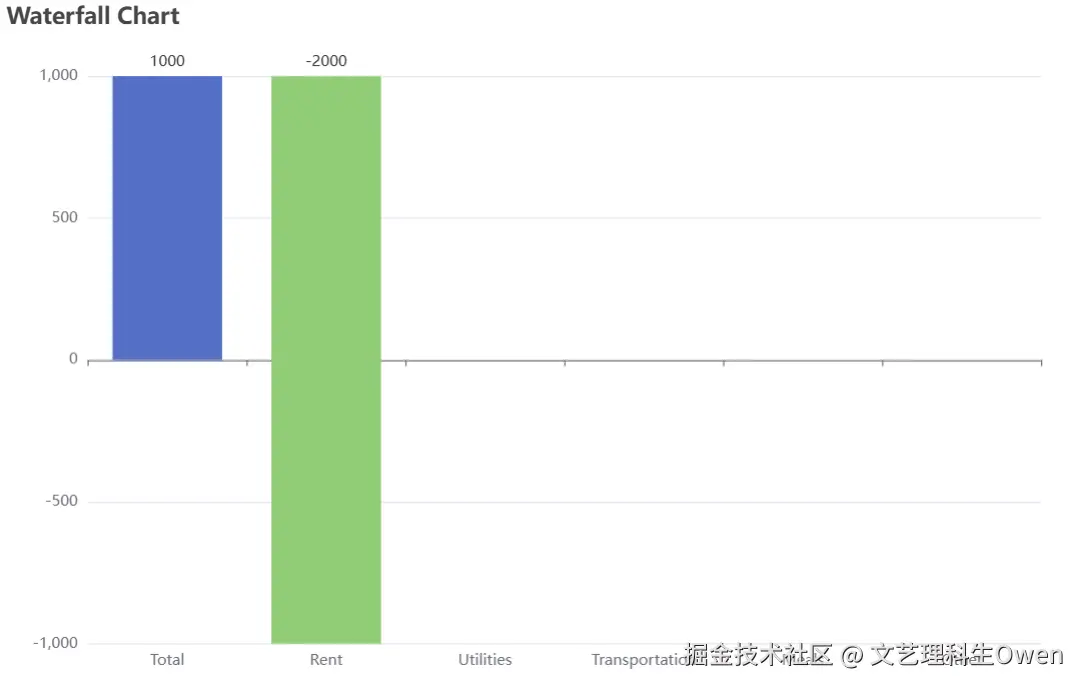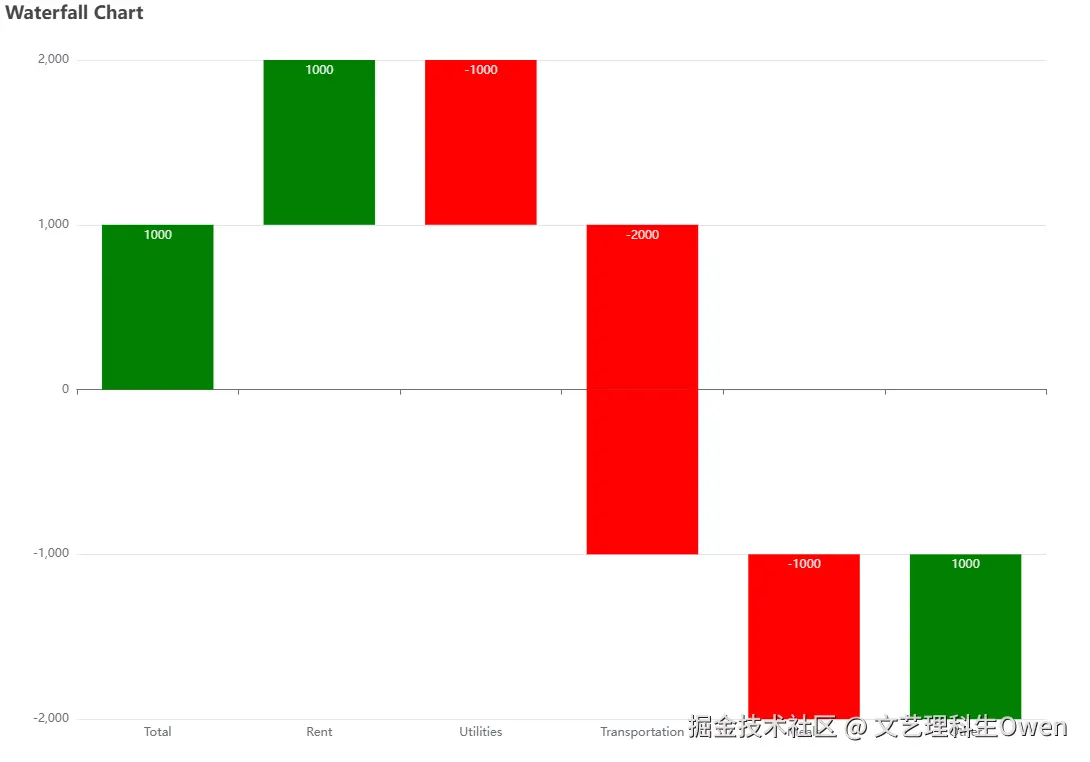 echarts中默认的瀑布图示例仅支持y轴的正半轴,对负半轴处理无法兼容,需要分情况逐一处理。比如上一个值是正值,当前值为负值,应该先减去正值(对应增加值的series),然后再减去负值(对应减少值的series)。