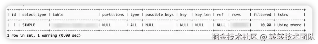 作为有“临床经验”的老司机,第一直觉是先用explain分析。explain用了毫秒级的时间就输出了这样一份执行计划,果然它很快,两分钟都不到。