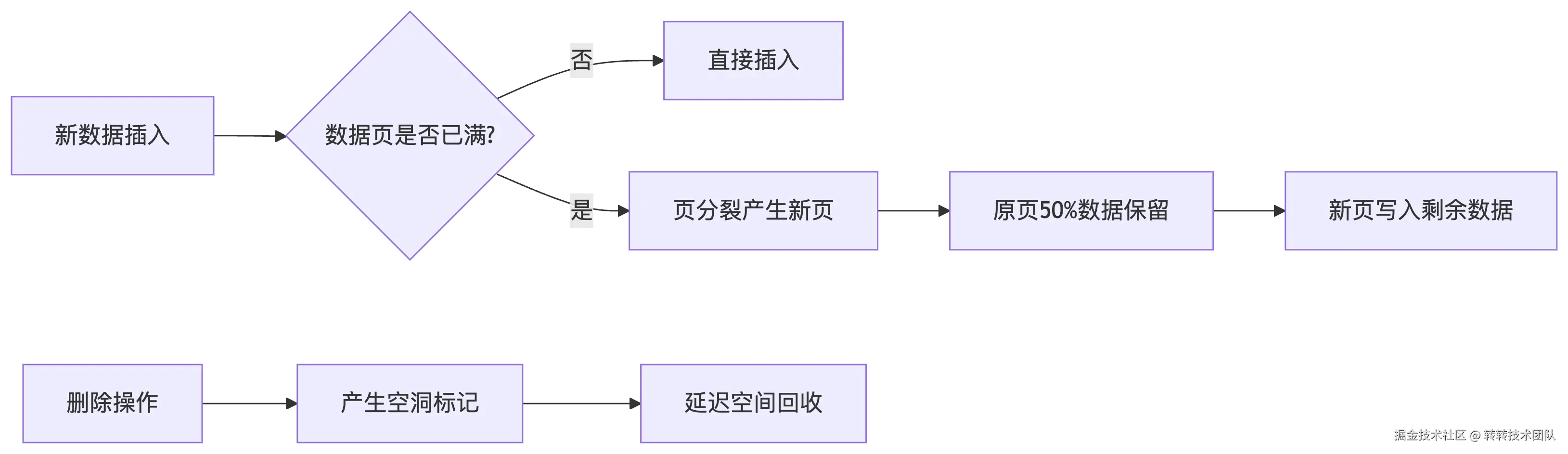 • 页内空洞 (Page Fragmentation) 频繁删除导致页内出现大量空洞,页实际利用率下降(如页利用率从90%降到50%)。 读取相同数据量需要访问更多页,IO次数增加。