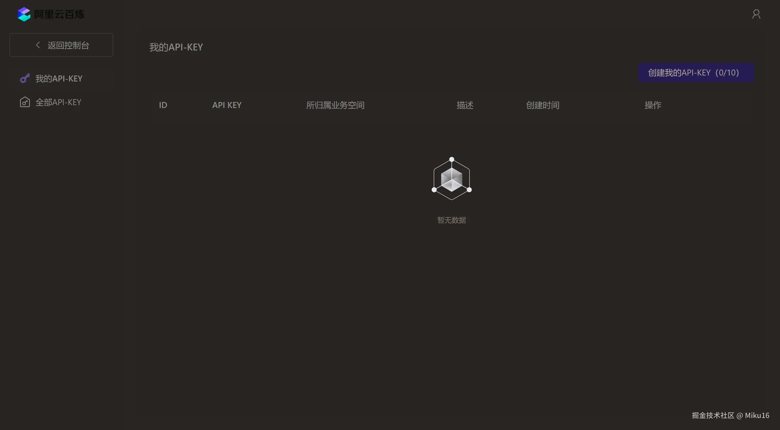 前往API-KEY页面,单击创建我的API-KEY。在已创建的API Key操作列,单击查看,获取API KEY。接下来将其配置到环境变量。