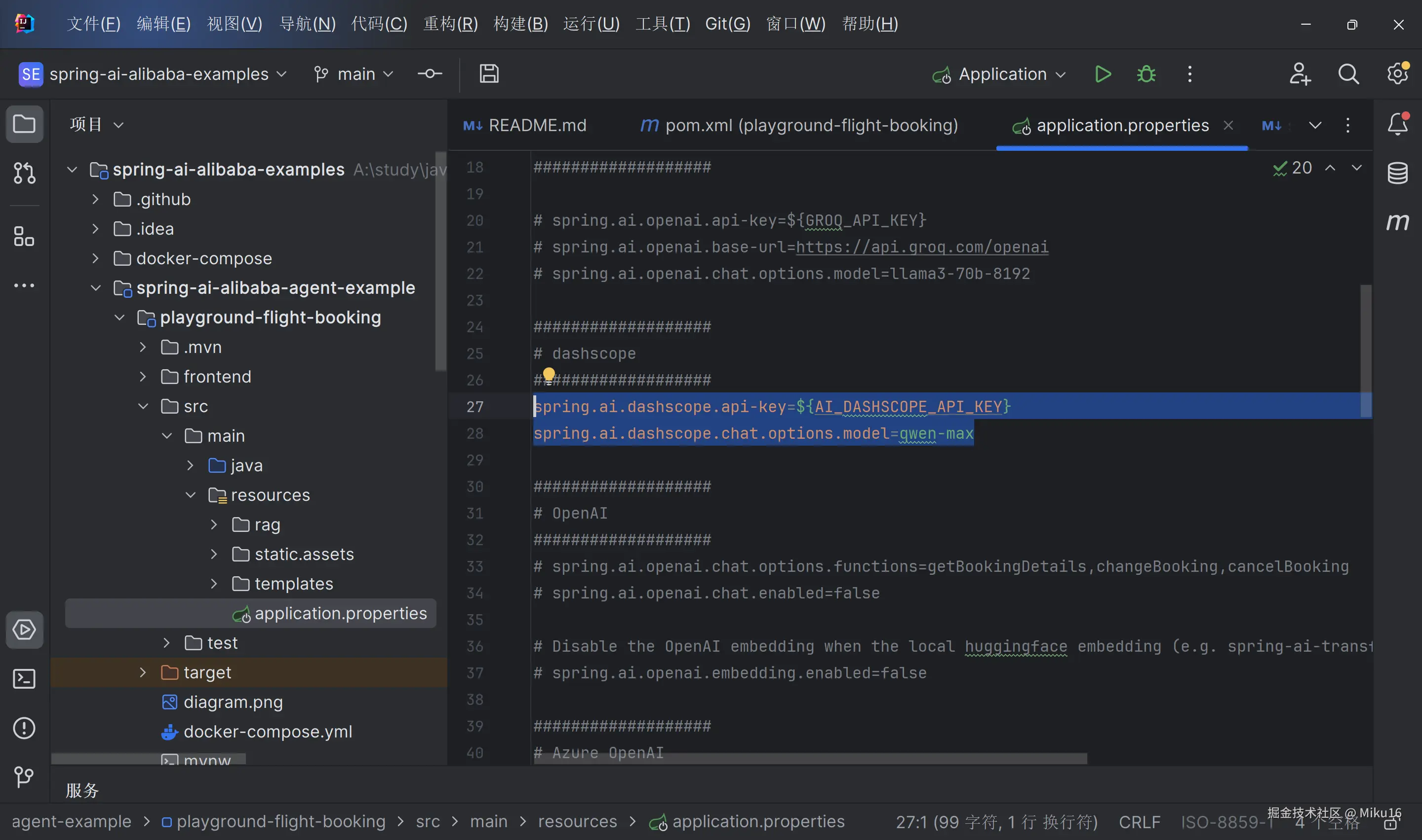 application.properties文件中:spring.ai.dashscope.api-key=${AI_DASHSCOPE_API_KEY} spring.ai.dashscope.chat.options.model=qwen-max构建 Jar 包
