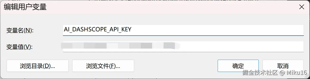 或通过高级系统设置 AI_DASHSCOPE_API_KEY 环境变量。