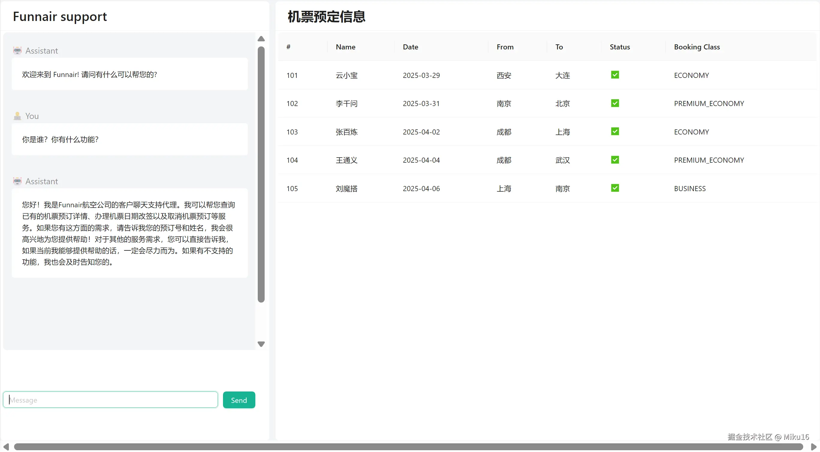 打开http://localhost:9000/,在左侧对话界面尝试发送消息,成功和AI客服进行了对话。