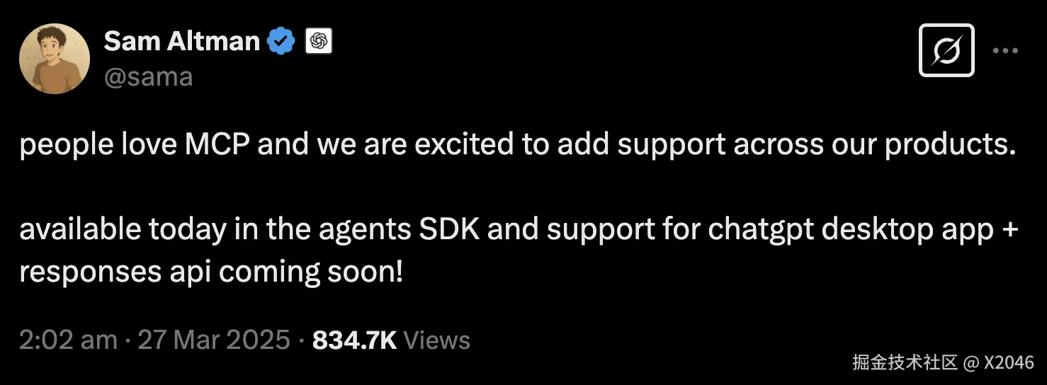 在人工智能工具生态中,标准化的协议至关重要,以确保不同系统之间的无缝交互。Anthropic 推出的 MCP(Model Context Protocol) 已成为事实上的行业标准。昨日,OpenAI CEO 山姆·奥特曼正式宣布,OpenAI 的 Agents SDK 现已全面支持 MCP,而 ChatGPT 桌面客户端和 API 也将陆续兼容 MCP。如果你还不了解MCP,不妨阅读我的上一篇文章一文读懂 MCP!大模型如何用它连接世界,打造更智能的 AI Agent?。