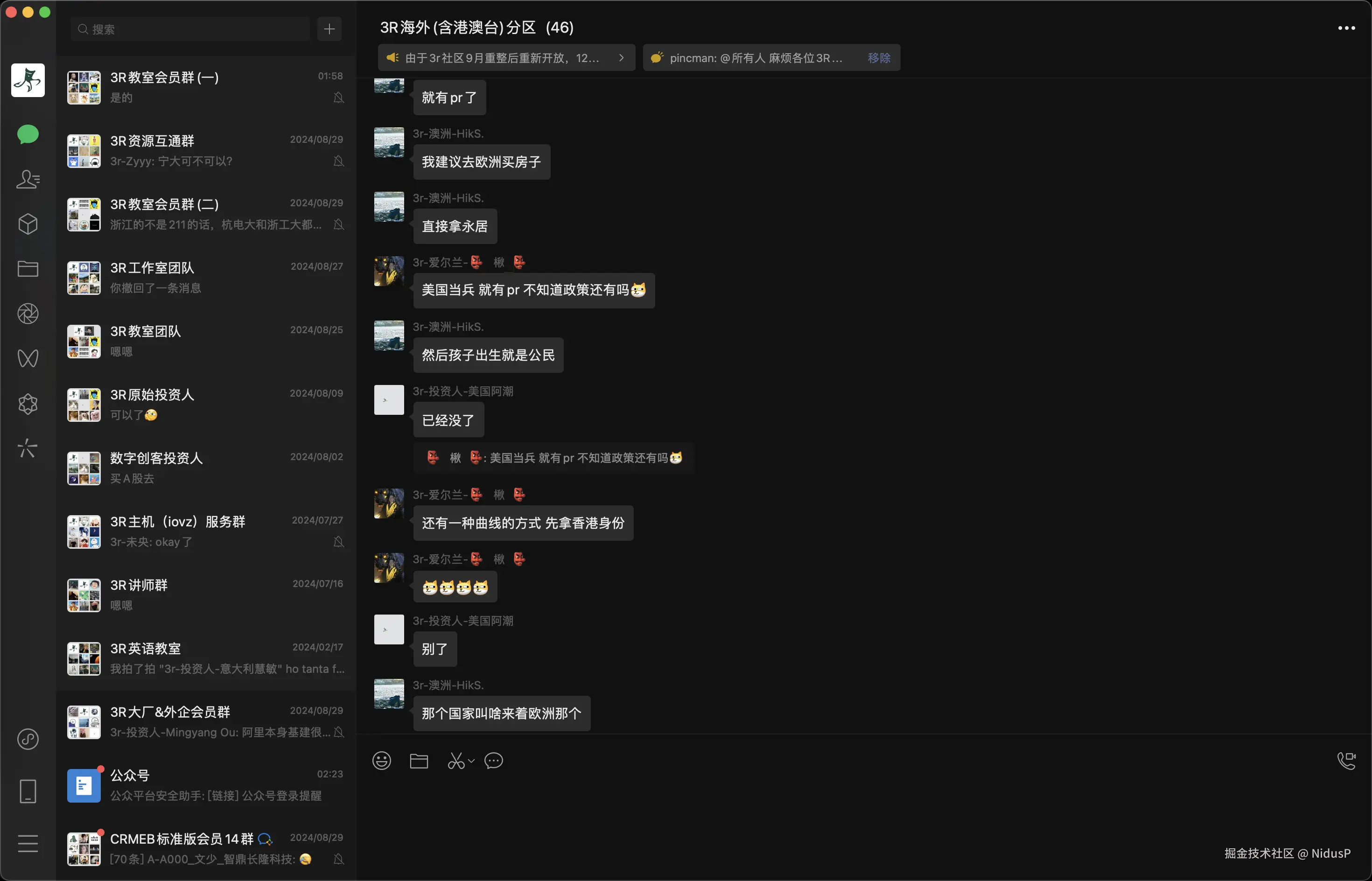 - 海外会员群:大概有50来位海外会员和海外客户在里面,可以求助移动的成本和方法、拿工签的办法,以及海外坐班岗位招聘和求职互助等