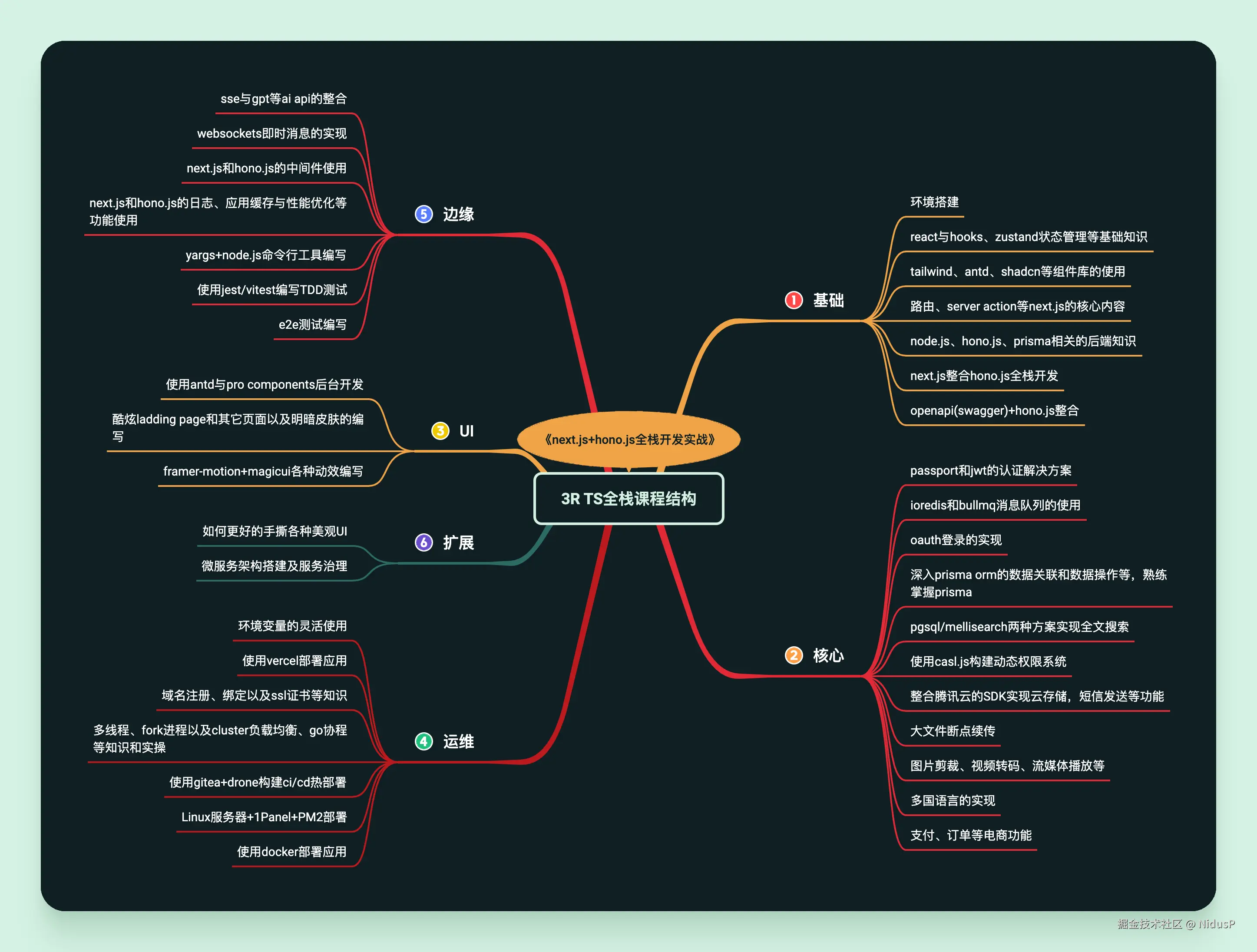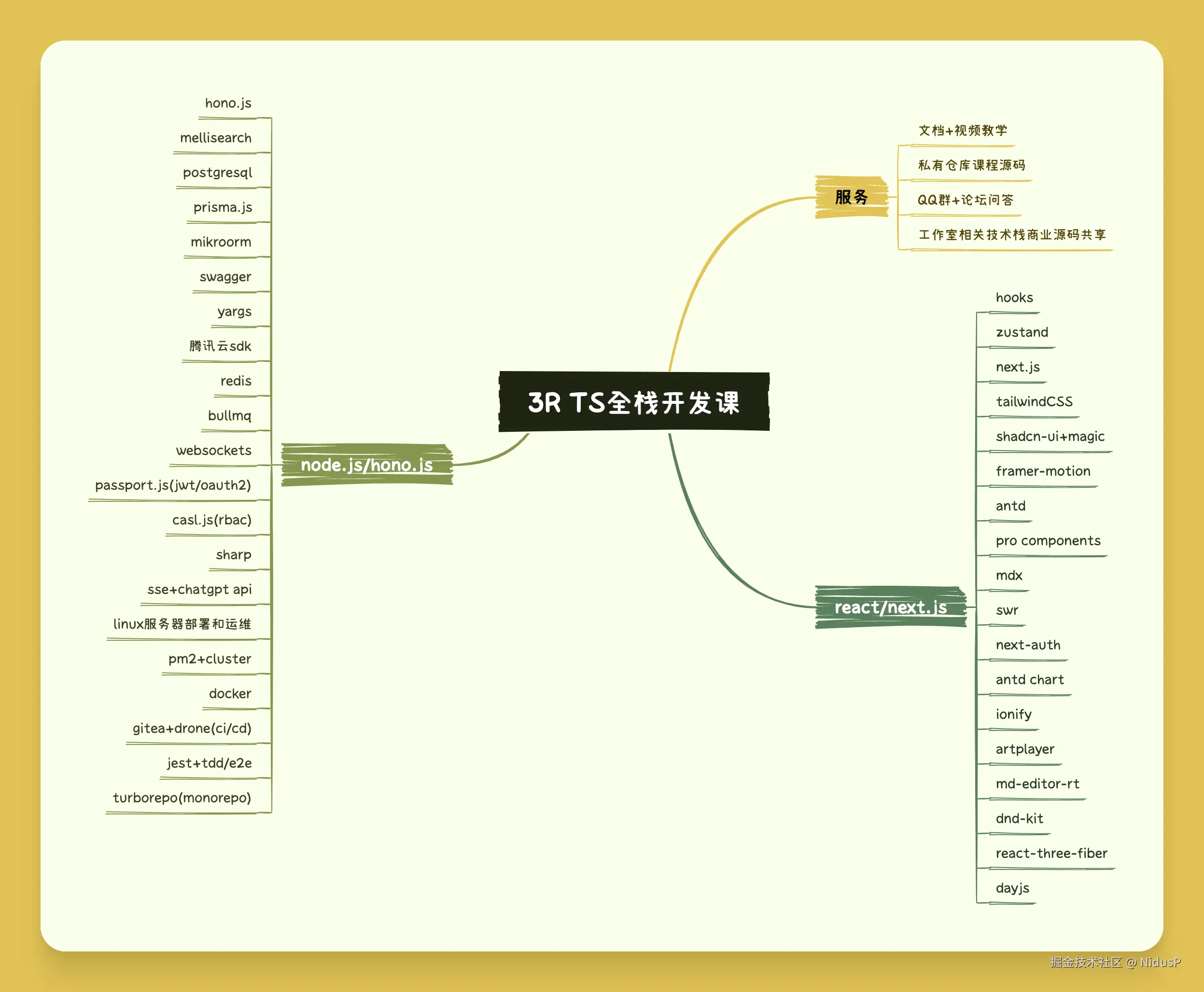 技术课以typescript、react/next.js、node.js/hono/nestjs、AI/Serverless、服务器运维部署/CICD等技术栈为主,以一个通用的社区cms系统为主线展开;变现课则涉及远程/高薪工作求职准备和方法、国内海外外包接单渠道和谈判技巧、独立作品开发的推广和运营方案、工商税务知识等