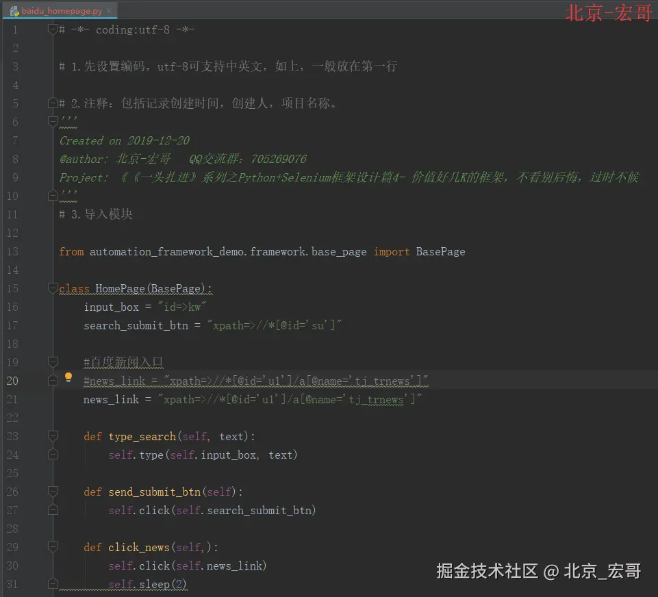 前面文章,我们实现了框架的一部分功能,包括日志类和浏览器引擎类的封装,今天我们继续封装一个基类和介绍如何实现POM。关于基类,是这样定义的:把一些常见的页面操作的selenium封装到base_page.py这个类文件,以后每个POM中的页面类,都继承这个基类,这样每个页面类都有基类的方法,这个我们会在这篇文章由宏哥实现。