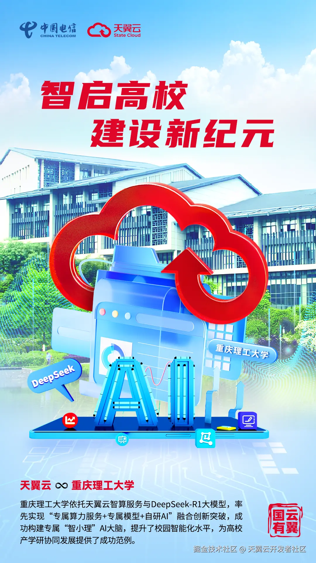 针对教育行业高标准的安全、稳定性等方面要求,天翼云给出了创新解决方案,通过全栈专属化部署架构,为重庆理工大学构建了专属天翼云智算服务、专属多模态智能服务、专属定制化开发服务三大核心能力体系。