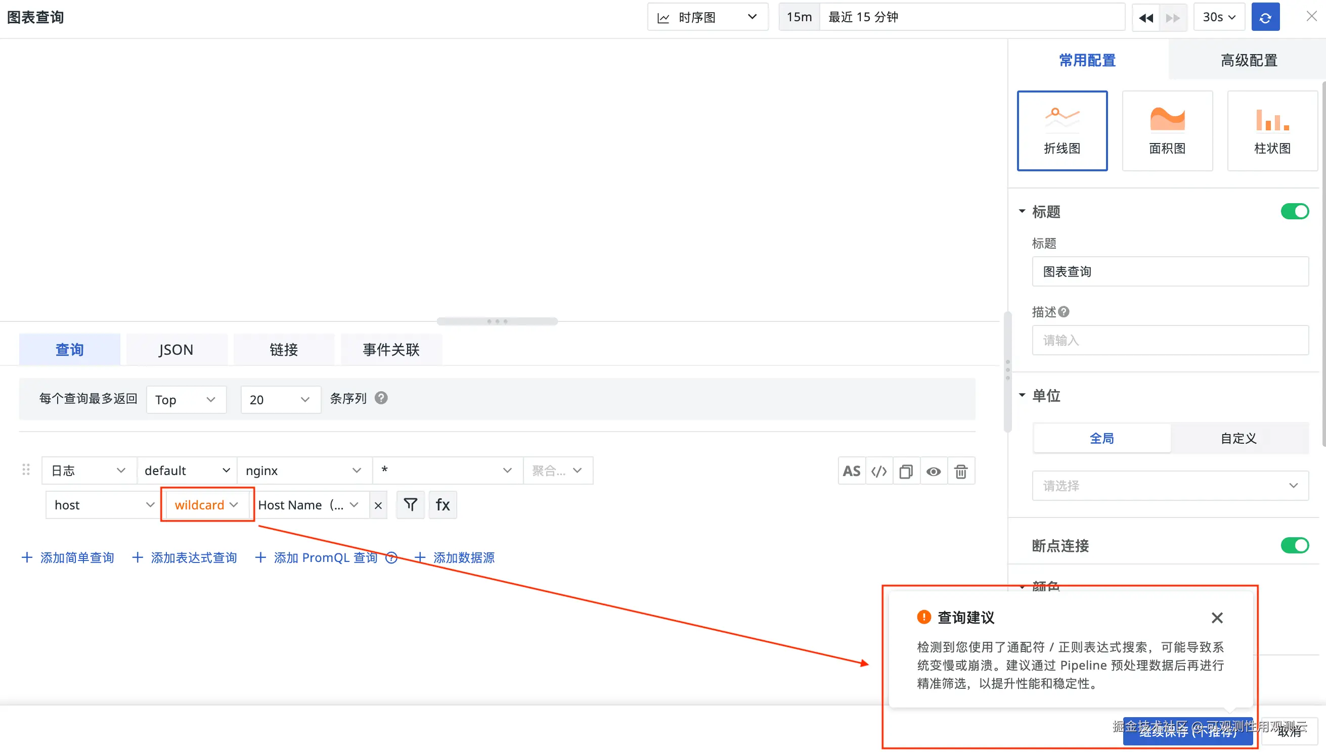 - 图表查询:在 DQL 查询中,使用 “wildcard” 或“正则”时,新增查询建议提示。