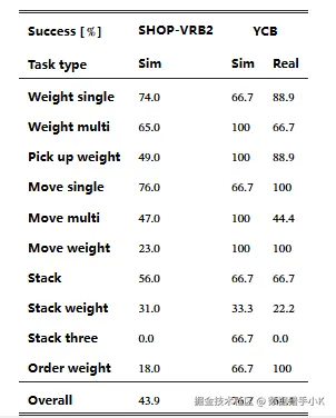 SHOP-VRB2 (sim) 和 YCB 数据集 (sim/real) 上基线方法的成功率。