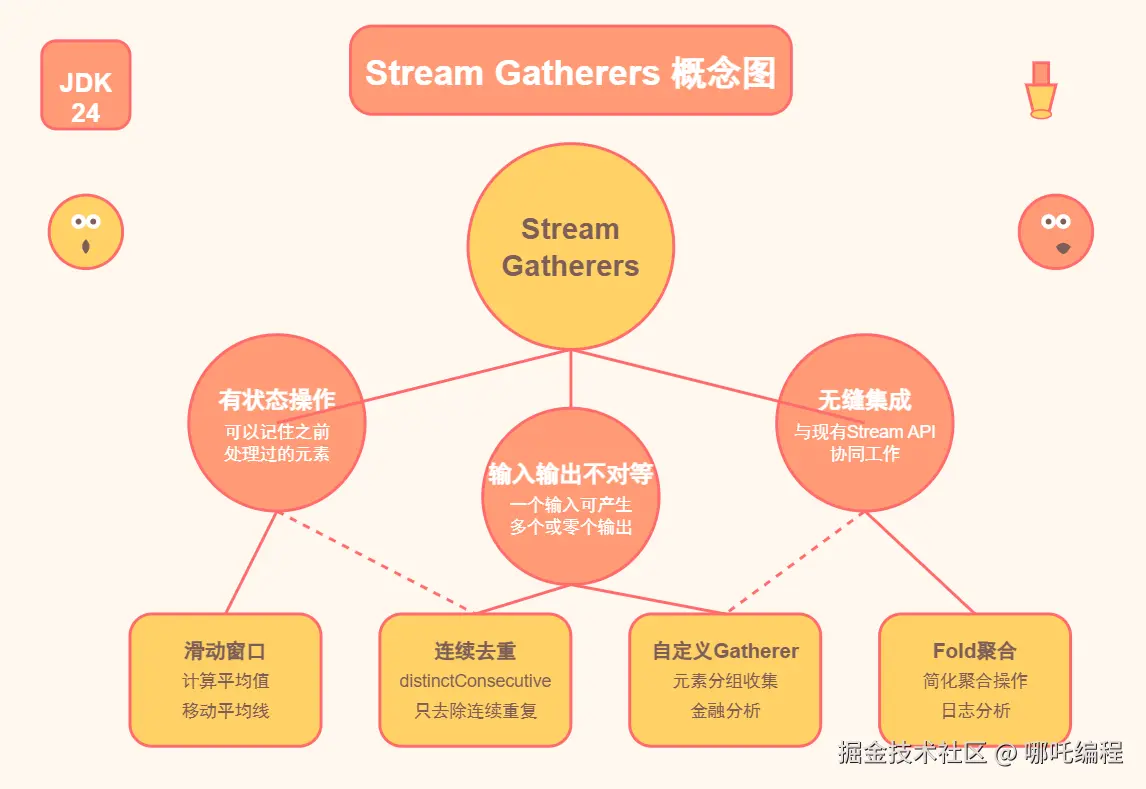 想象一下,如果传统的Stream API是工厂生产线上的基础工序,那么Gatherers就是那个能记忆、能思考、还能一变多的"超级工序"。