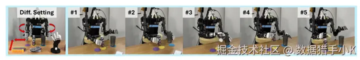 机器人在四个不同的背景上执行传杯任务。左侧显示四种背景变化,而右侧表示两个传递方向:(#1 - 右手将杯子传给左手,#2 - 左手将杯子传给右手)。
